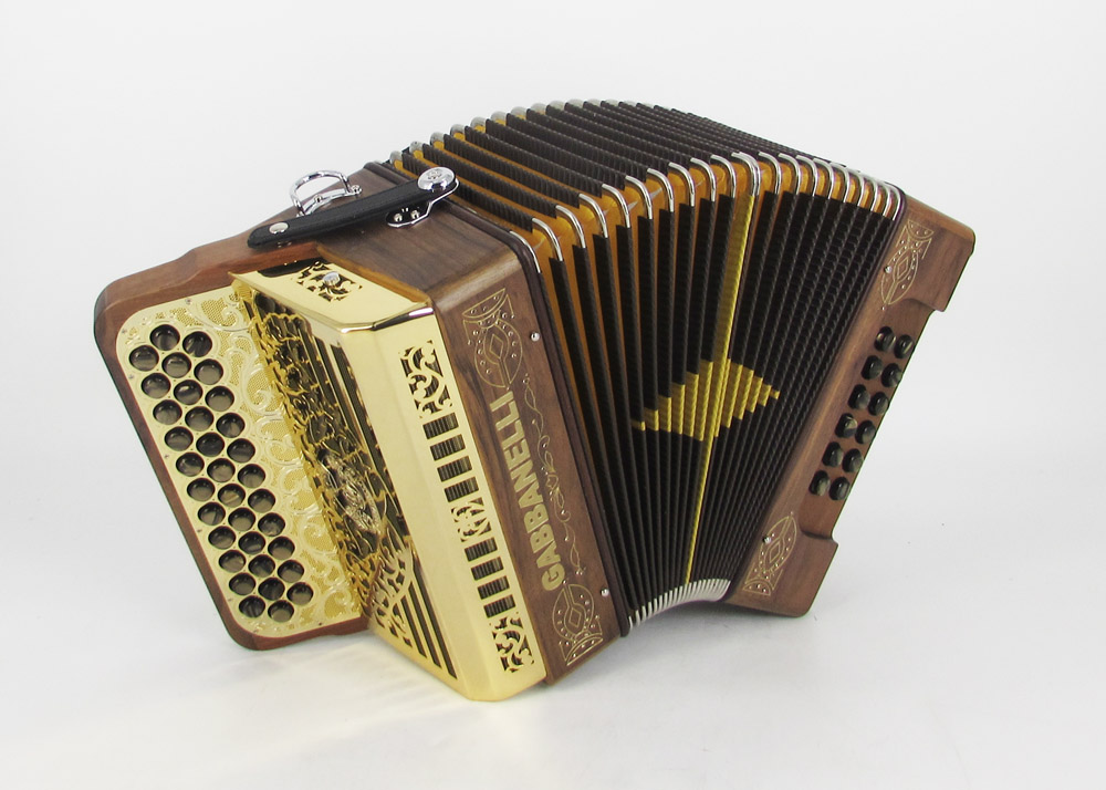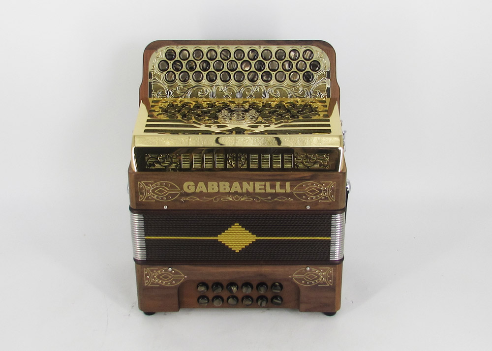 Long Description: This super compact streamline Gabbanelli accordion has an Italian Solid Walnut wood body with special design soft action and strong sound with 34 buttons. Our Gabbanelli accordions are created from classic Italian artisan’s techniques to produce the best quality instrument that will last for years to come. Model 101 Solid Wood- 34 Button Deluxe Wood Body Design. Complete with case, straps and warranty. Bass reed available upon request.