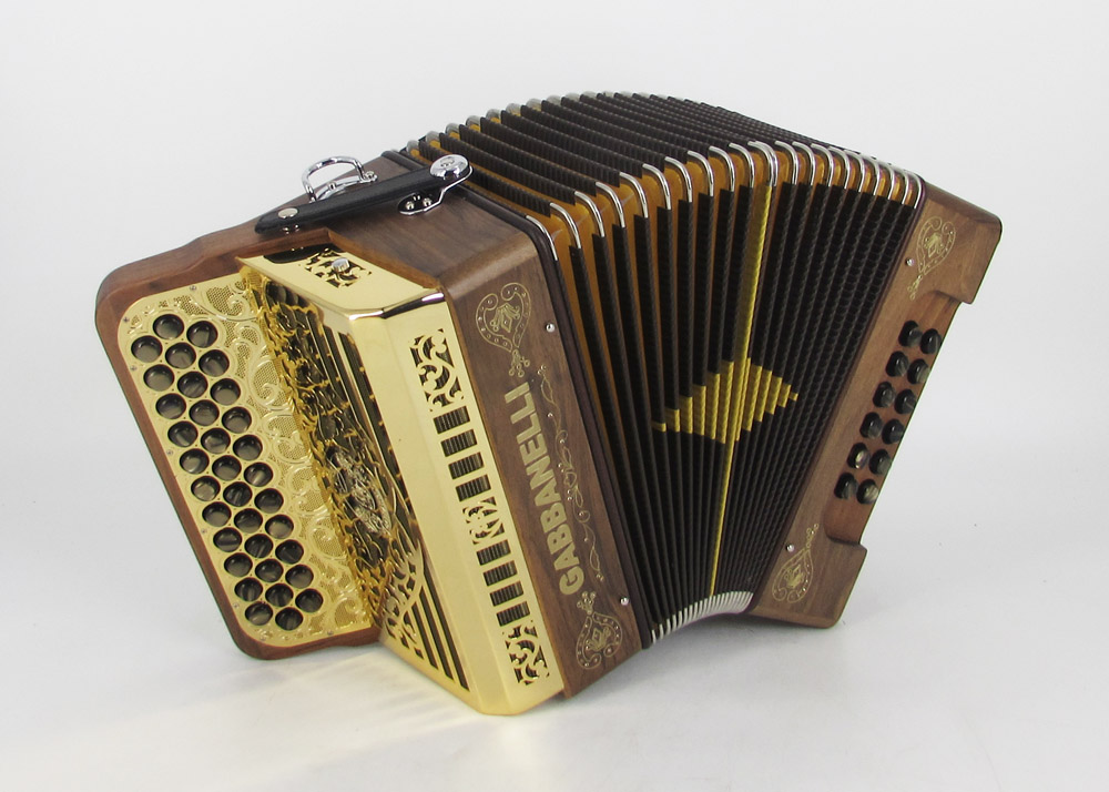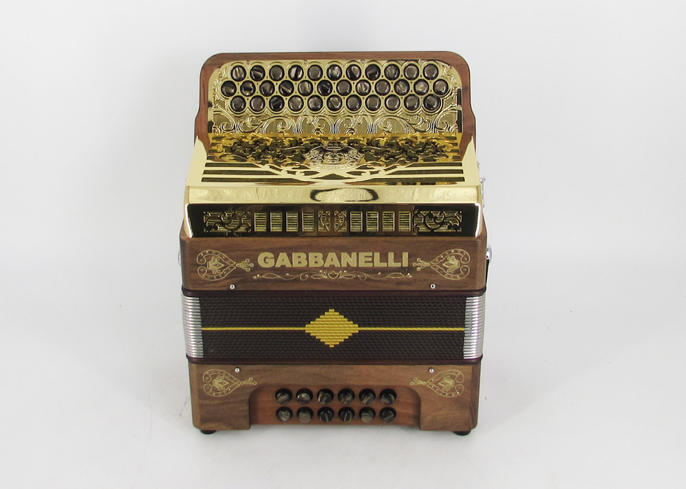 Long Description: This super compact streamline Gabbanelli accordion has an Italian Solid Walnut wood body with special design soft action and strong sound with 34 buttons. Our Gabbanelli accordions are created from classic Italian artisan’s techniques to produce the best quality instrument that will last for years to come. Model 101 Solid Wood- 34 Button Deluxe Wood Body Design. Complete with case, straps and warranty. Bass reed available upon request.