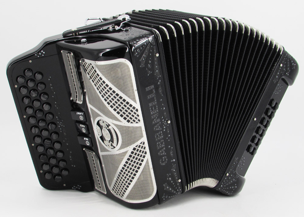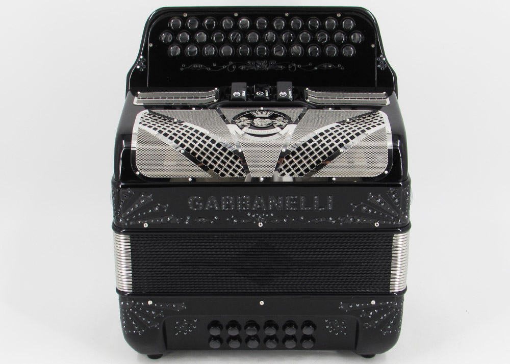 Custom designed lightweight compact Gabbanelli accordion with 3 registers 34 button. Highly preferred for its powerful sound, natural tuning and light weight compact stylish design. Handcrafted in Italy from the highest quality materials. Gabbanelli Model 103 Compact- 34 Buttons – 3 sound registers. Bass reeds available upon request. Complete with case, straps and warranty.