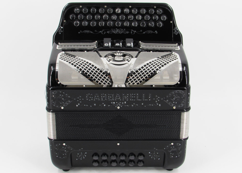 Custom designed lightweight compact Gabbanelli accordion with 3 registers 34 button. Highly preferred for its powerful sound, natural tuning and light weight compact stylish design. Handcrafted in Italy from the highest quality materials.  Gabbanelli Model 103 Compact- 34 Buttons – 3 sound registers. Bass reeds available upon request. Complete with case, straps and warranty.