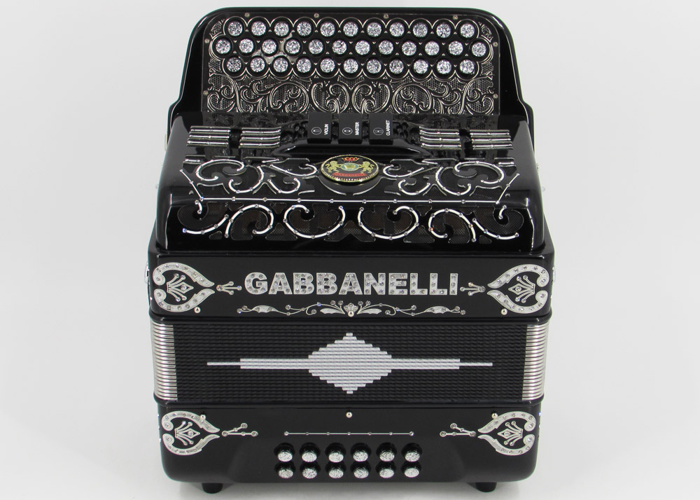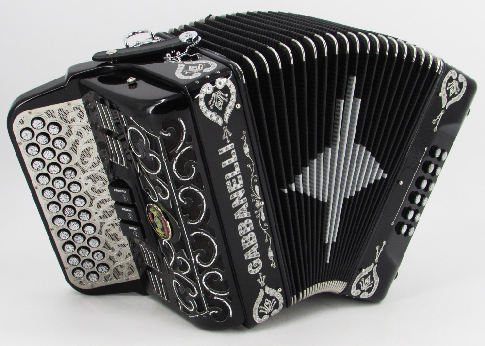 Custom designed lightweight compact Gabbanelli accordion with 3 registers 34 button. Highly preferred for its powerful sound, natural tuning and light weight compact stylish design. Handcrafted in Italy from the highest quality materials.  Gabbanelli Model 103 Compact- 34 Buttons – 3 sound registers. Bass reeds available upon request. Complete with case, straps and warranty.