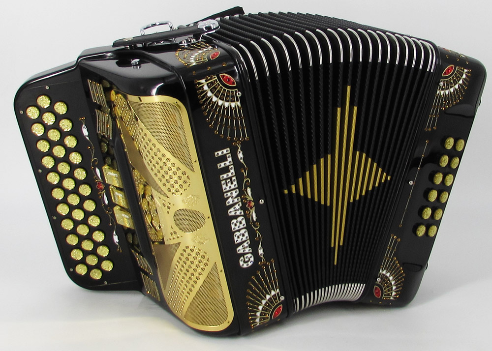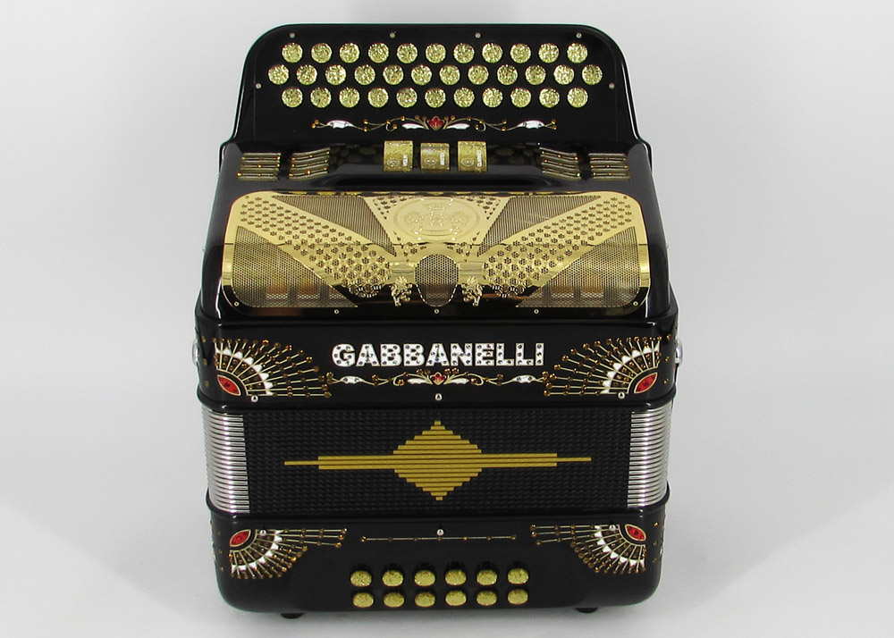 Custom designed lightweight compact Gabbanelli accordion with 3 registers 34 button. Highly preferred for its powerful sound, natural tuning and light weight compact stylish design. Handcrafted in Italy from the highest quality materials. Gabbanelli Model 103 Compact- 34 Buttons – 3 sound registers. Bass reeds available upon request. Complete with case, straps and warranty.