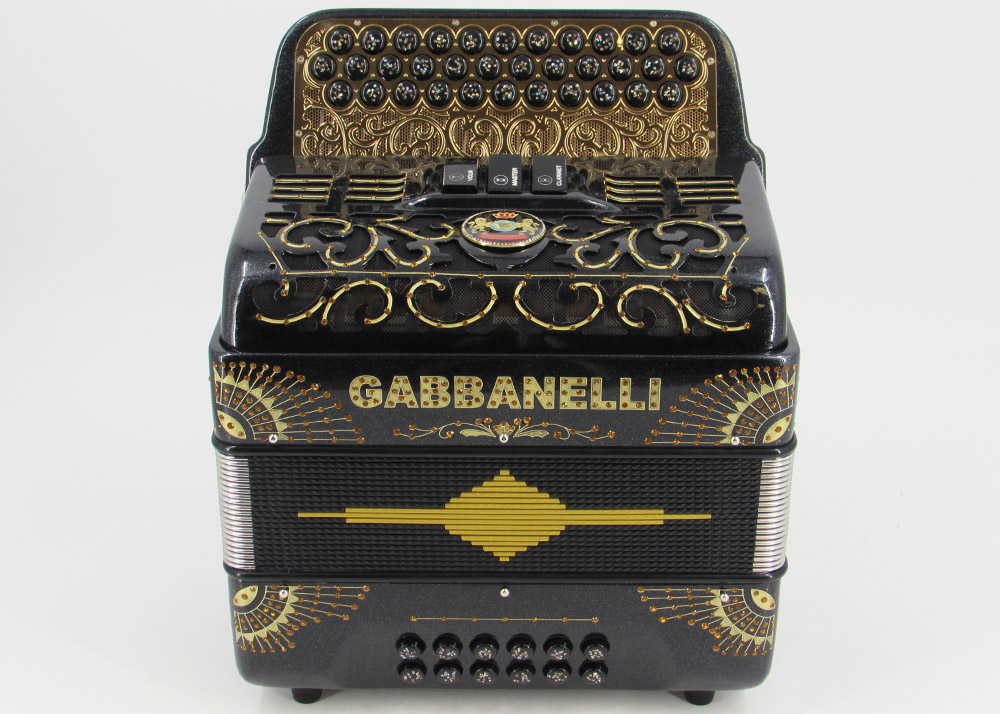 Custom designed lightweight compact Gabbanelli accordion with 3 registers 34 button. Highly preferred for its powerful sound, natural tuning and light weight compact stylish design. Handcrafted in Italy from the highest quality materials. Gabbanelli Model 103 Compact- 34 Buttons – 3 sound registers. Bass reeds available upon request. Complete with case, straps and warranty.