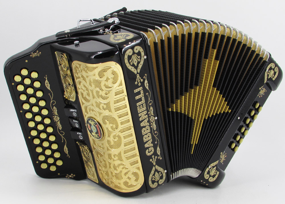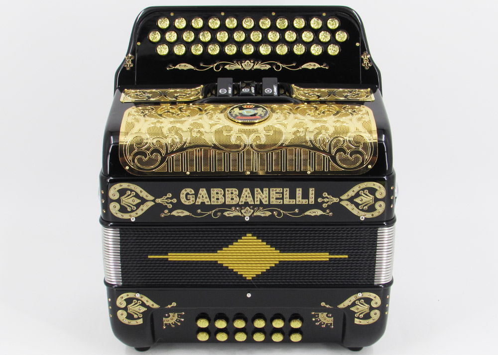 Custom designed lightweight compact Gabbanelli accordion with 3 registers 34 button. Highly preferred for its powerful sound, natural tuning and light weight compact stylish design. Handcrafted in Italy from the highest quality materials. Gabbanelli Model 103 Compact- 34 Buttons – 3 sound registers. Bass reeds available upon request. Complete with case, straps and warranty.