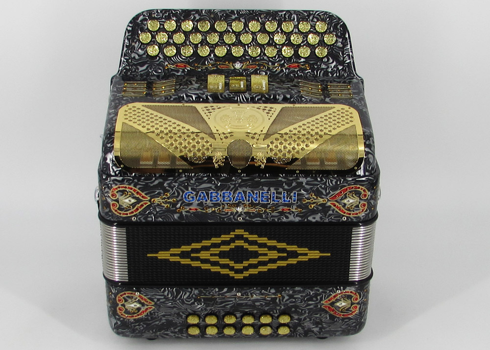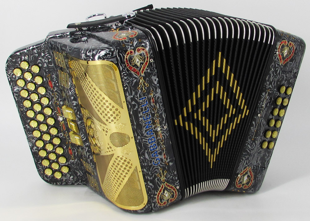 Custom designed lightweight compact Gabbanelli accordion with 3 registers 34 button. Highly preferred for its powerful sound, natural tuning and light weight compact stylish design. Handcrafted in Italy from the highest quality materials. Gabbanelli Model 103 Compact- 34 Buttons – 3 sound registers. Bass reeds available upon request. Complete with case, straps and warranty.