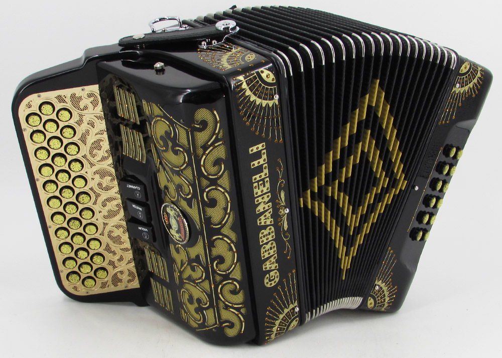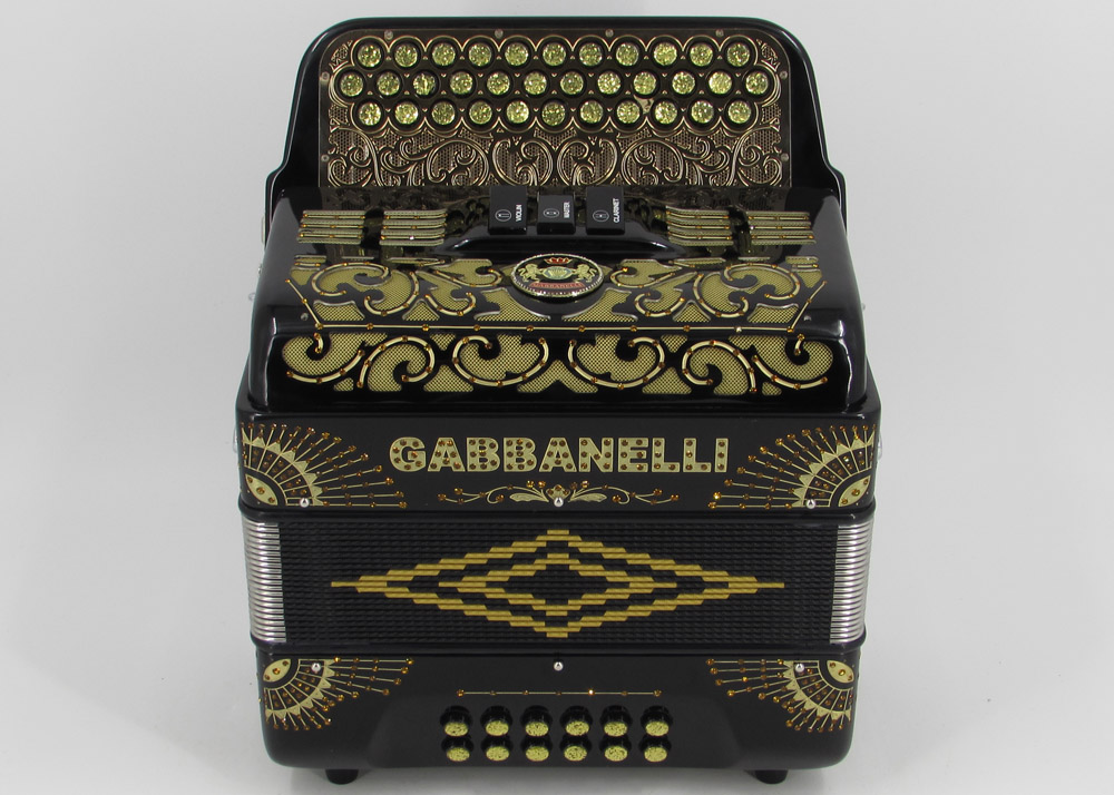 Custom designed lightweight compact Gabbanelli accordion with 3 registers 34 button. Highly preferred for its powerful sound, natural tuning and light weight compact stylish design. Handcrafted in Italy from the highest quality materials. Gabbanelli Model 103 Compact- 34 Buttons – 3 sound registers. Bass reeds available upon request. Complete with case, straps and warranty.