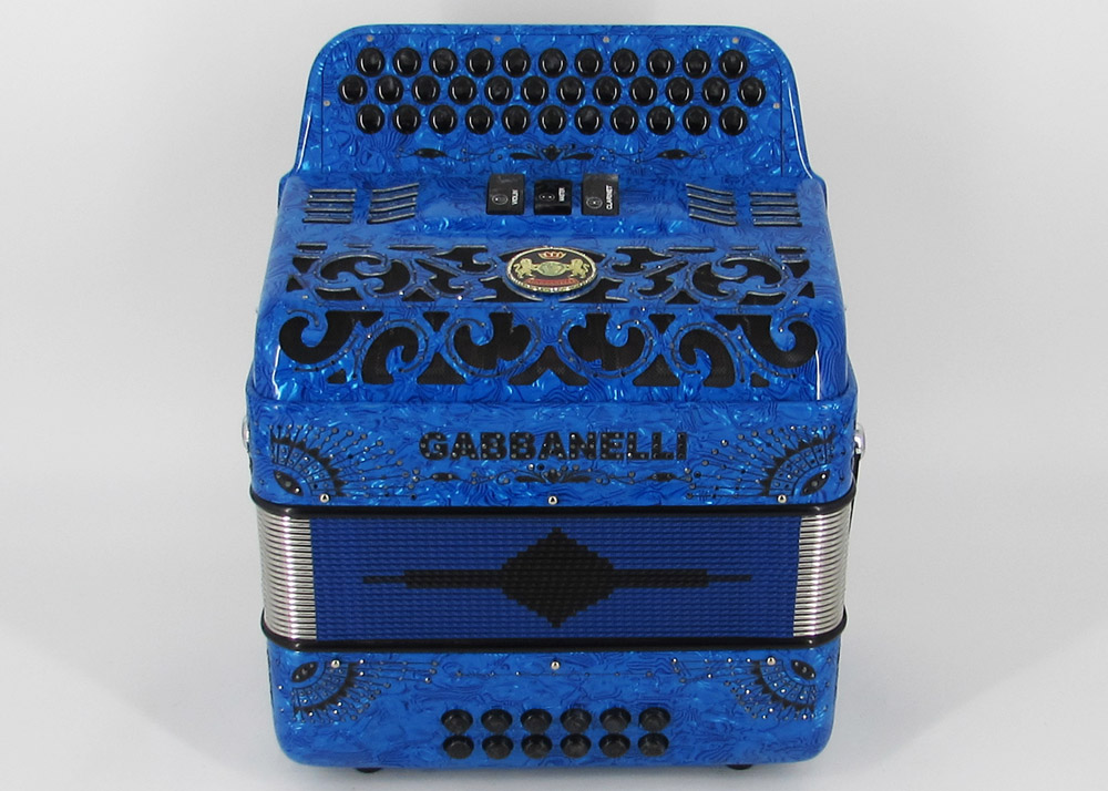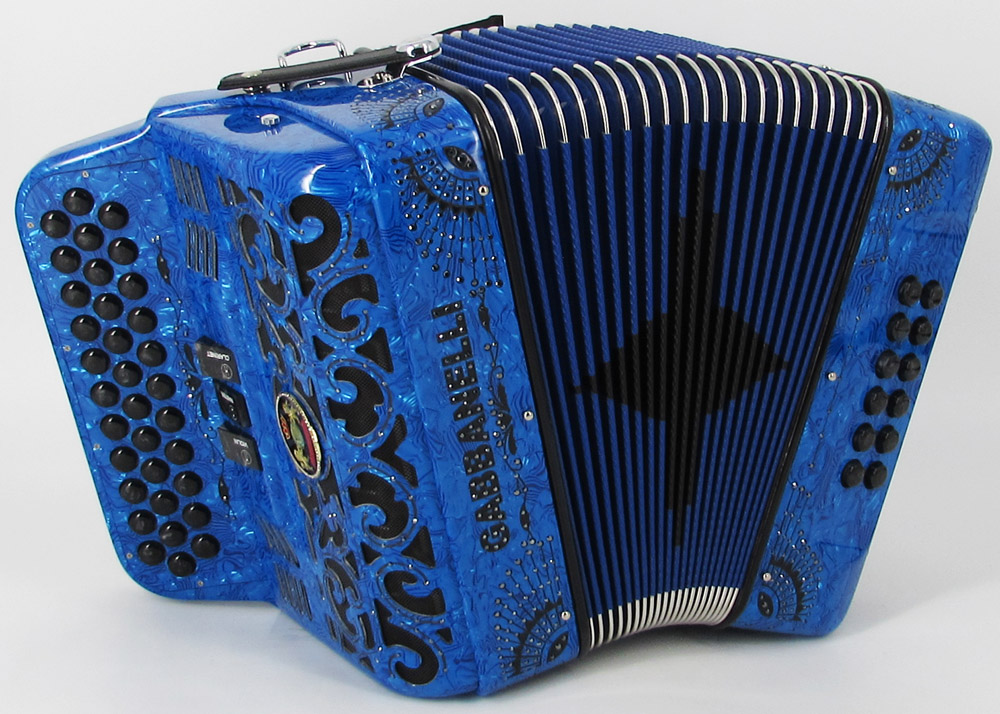 Custom designed lightweight compact Gabbanelli accordion with 3 registers 34 button. Highly preferred for its powerful sound, natural tuning and light weight compact stylish design. Handcrafted in Italy from the highest quality materials. Gabbanelli Model 103 Compact- 34 Buttons – 3 sound registers. Bass reeds available upon request. Complete with case, straps and warranty.
