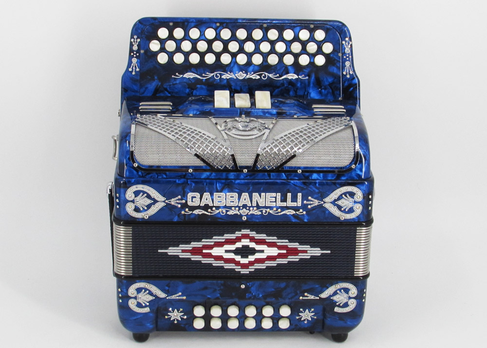 Custom designed lightweight compact Gabbanelli accordion with 3 registers 34 button. Highly preferred for its powerful sound, natural tuning and light weight compact stylish design. Handcrafted in Italy from the highest quality materials. Gabbanelli Model 103 Compact- 34 Buttons – 3 sound registers. Bass reeds available upon request. Complete with case, straps and warranty.