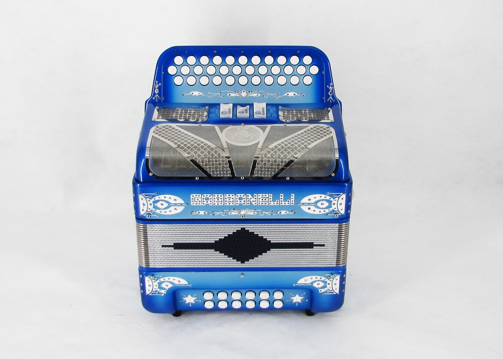 Custom designed lightweight compact Gabbanelli accordion with 3 registers 34 button. Highly preferred for its powerful sound, natural tuning and light weight compact stylish design. Handcrafted in Italy from the highest quality materials. Gabbanelli Model 103 Compact- 34 Buttons – 3 sound registers. Bass reeds available upon request for an additional cost. Complete with case, straps and warranty.