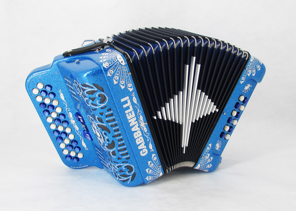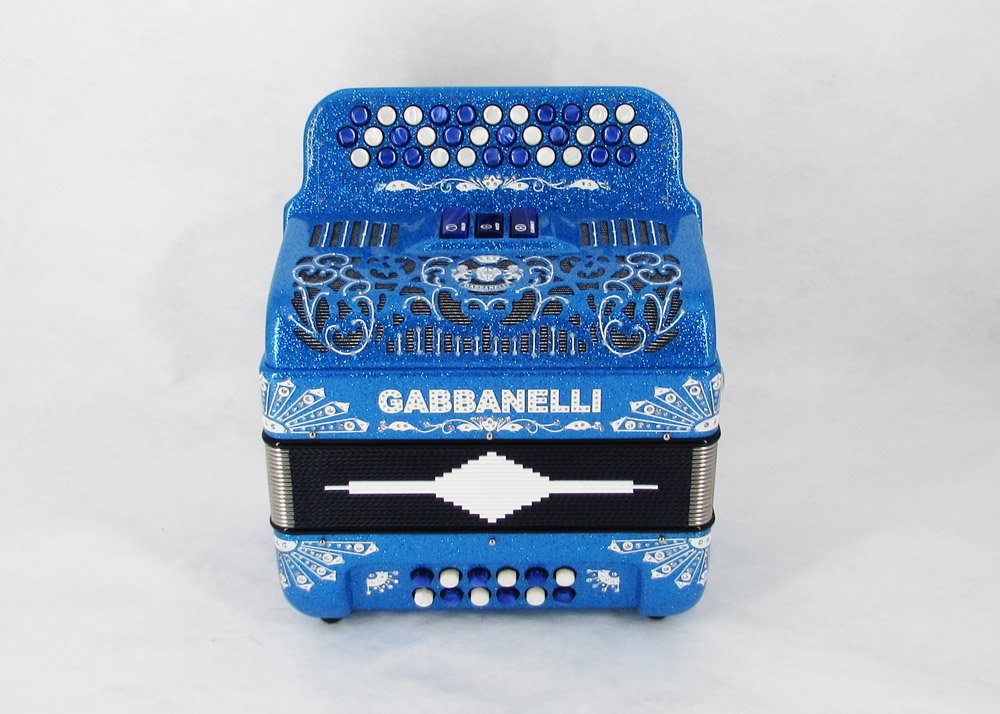 Custom designed lightweight compact Gabbanelli accordion with 3 registers 34 button. Highly preferred for its powerful sound, natural tuning and light weight compact stylish design. Handcrafted in Italy from the highest quality materials. Gabbanelli Model 103 Compact- 34 Buttons – 3 sound registers. Bass reeds available upon request for an additional cost. Complete with case, straps and warranty.
