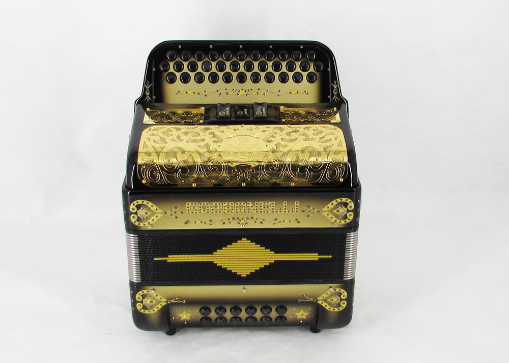 Custom designed lightweight compact Gabbanelli accordion with 3 registers 34 button. Highly preferred for its powerful sound, natural tuning and light weight compact stylish design. Handcrafted in Italy from the highest quality materials. Gabbanelli Model 103 Compact- 34 Buttons – 3 sound registers. Bass reeds available upon request for an additional cost. Complete with case, straps and warranty.