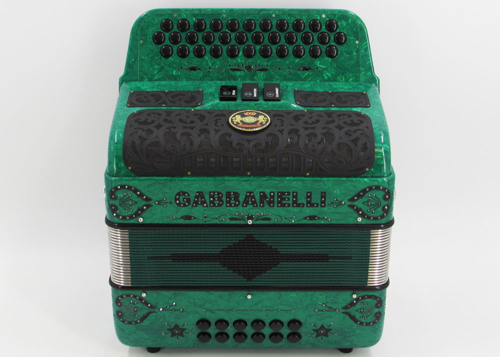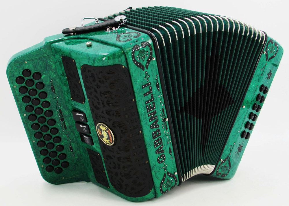 Custom designed lightweight compact Gabbanelli accordion with 3 registers 34 button. Highly preferred for its powerful sound, natural tuning and light weight compact stylish design. Handcrafted in Italy from the highest quality materials. Gabbanelli Model 103 Compact- 34 Buttons – 3 sound registers. Bass reeds available upon request. Complete with case, straps and warranty.