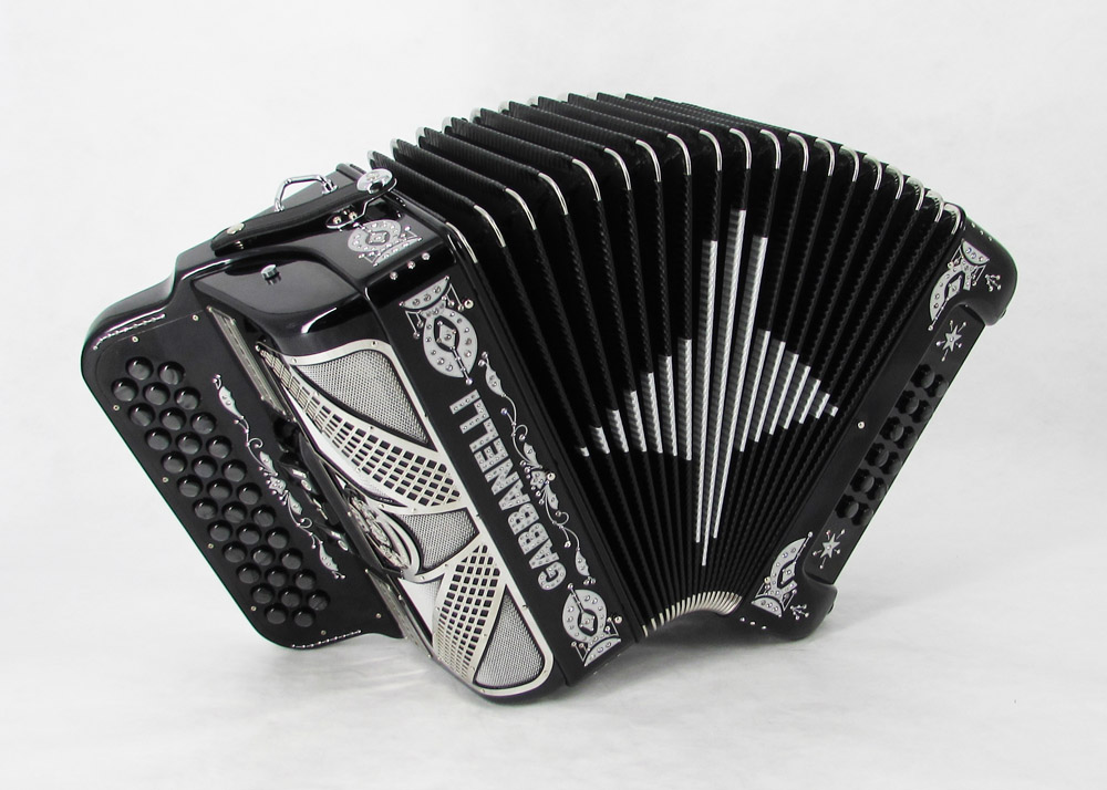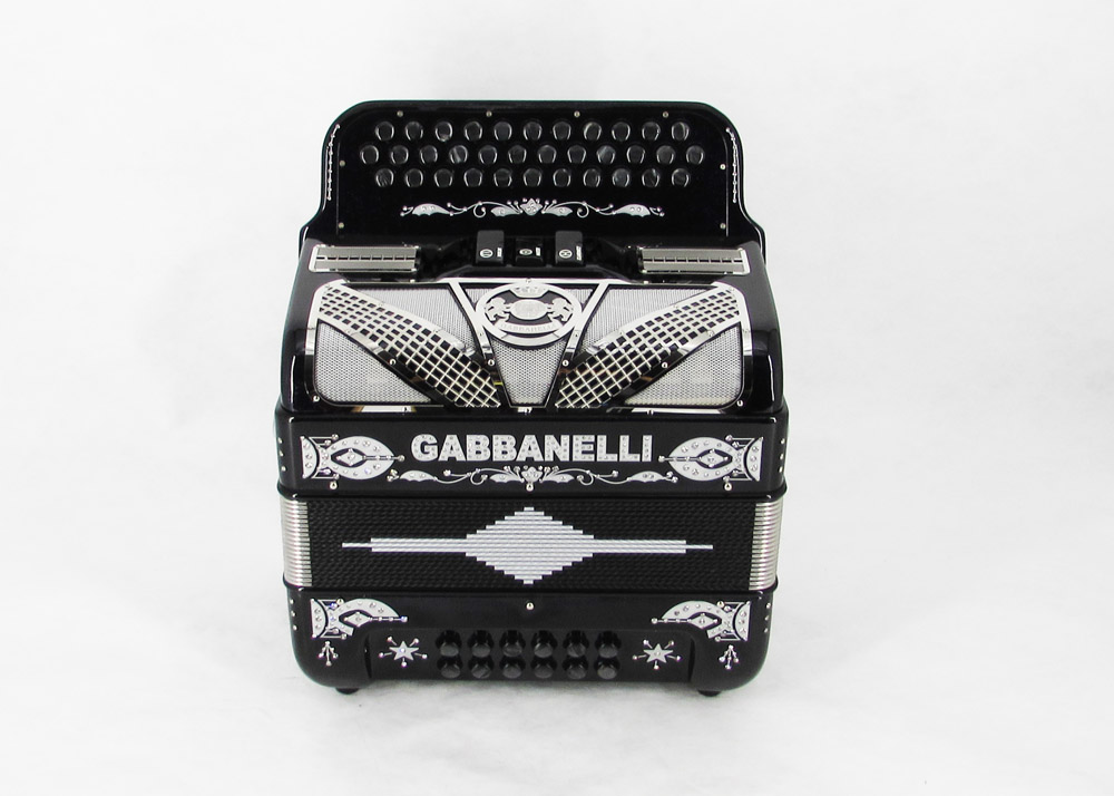 Custom designed lightweight compact Gabbanelli accordion with 3 registers 34 button. Highly preferred for its powerful sound, natural tuning and light weight compact stylish design. Handcrafted in Italy from the highest quality materials. Gabbanelli Model 103 Compact- 34 Buttons – 3 sound registers. Bass reeds available upon request for an additional cost. Complete with case, straps and warranty.