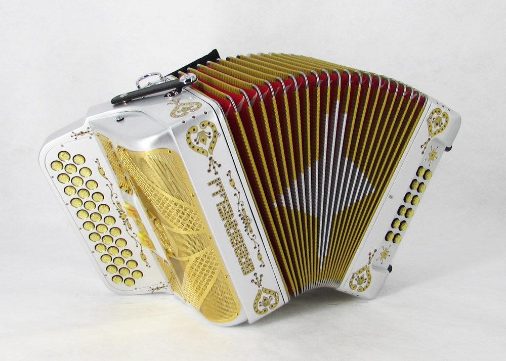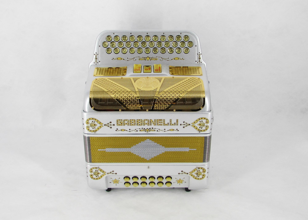 Custom designed lightweight compact Gabbanelli accordion with 3 registers 34 button. Highly preferred for its powerful sound, natural tuning and light weight compact stylish design. Handcrafted in Italy from the highest quality materials. Gabbanelli Model 103 Compact- 34 Buttons – 3 sound registers. Bass reeds available upon request for an additional cost. Complete with case, straps and warranty.