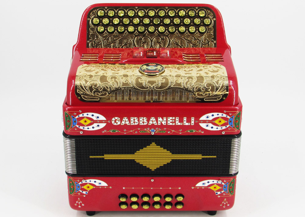 Custom designed lightweight compact Gabbanelli accordion with 3 registers 34 button. Highly preferred for its powerful sound, natural tuning and light weight compact stylish design. Handcrafted in Italy from the highest quality materials.  Gabbanelli Model 103 Compact- 34 Buttons – 3 sound registers. Bass reeds available upon request. Complete with case, straps and warranty.