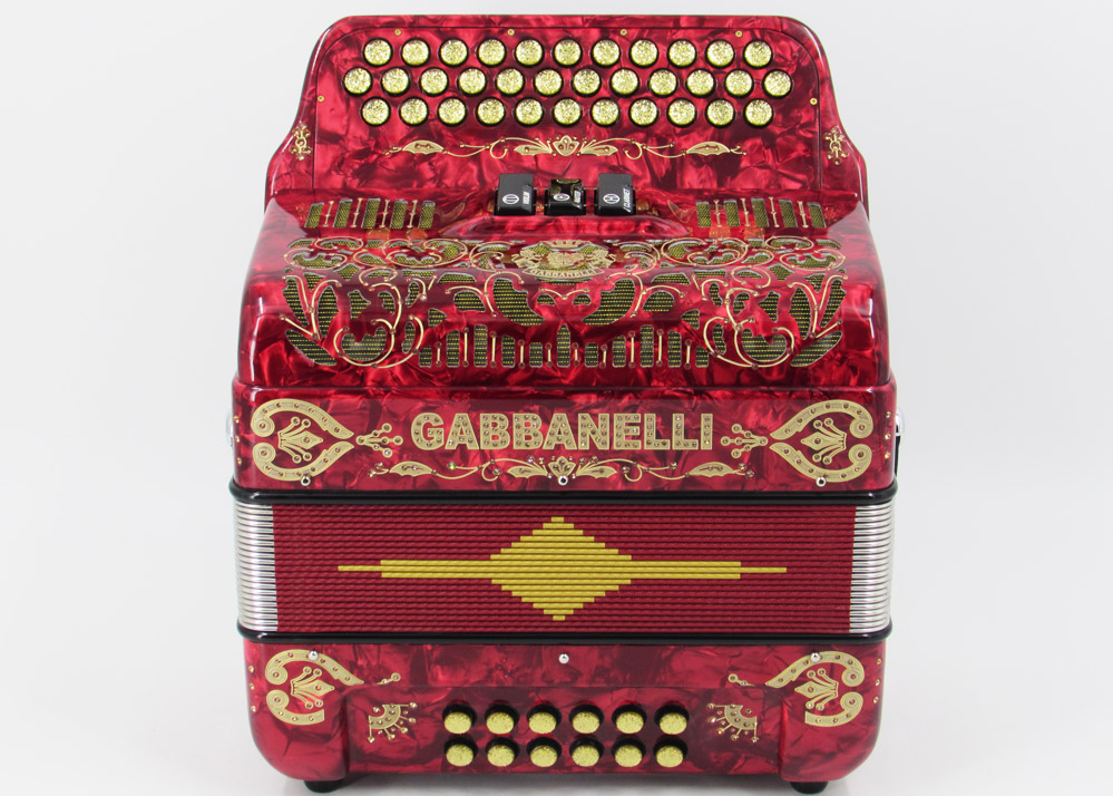 Custom designed lightweight compact Gabbanelli accordion with 3 registers 34 button. Highly preferred for its powerful sound, natural tuning and light weight compact stylish design. Handcrafted in Italy from the highest quality materials. Gabbanelli Model 103 Compact- 34 Buttons – 3 sound registers. Bass reeds available upon request. Complete with case, straps and warranty.