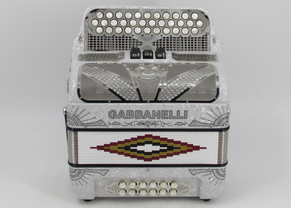 Custom designed lightweight compact Gabbanelli accordion with 3 registers 34 button. Highly preferred for its powerful sound, natural tuning and light weight compact stylish design. Handcrafted in Italy from the highest quality materials. Gabbanelli Model 103 Compact- 34 Buttons – 3 sound registers. Bass reeds available upon request. Complete with case, straps and warranty.