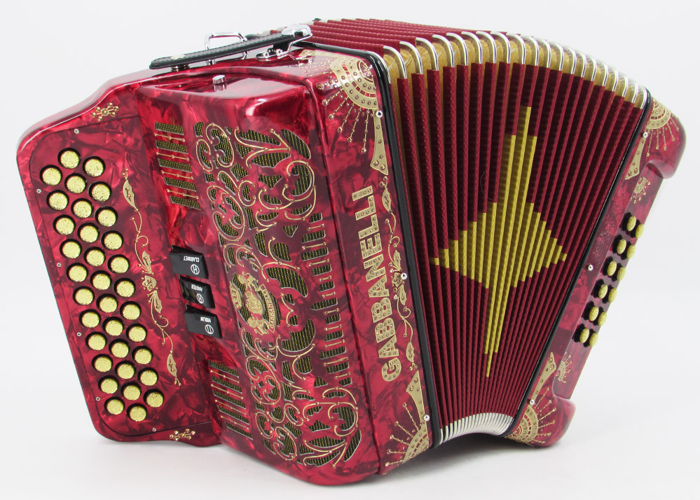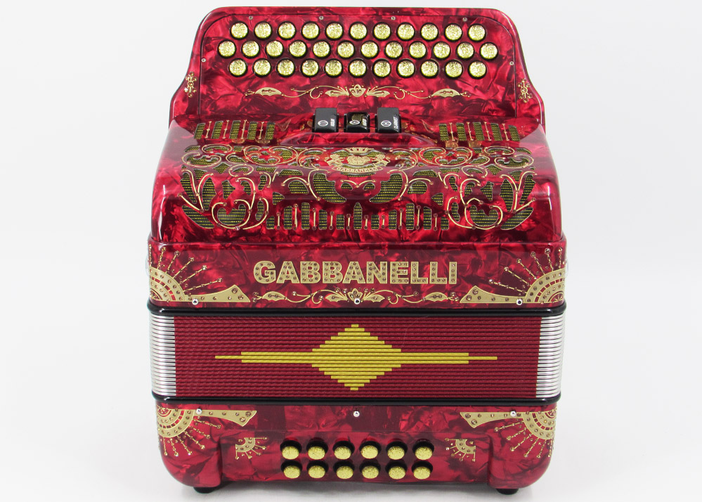 Custom designed lightweight compact Gabbanelli accordion with 3 registers 34 button. Highly preferred for its powerful sound, natural tuning and light weight compact stylish design. Handcrafted in Italy from the highest quality materials. Gabbanelli Model 103 Compact- 34 Buttons – 3 sound registers. Bass reeds available upon request. Complete with case, straps and warranty.
