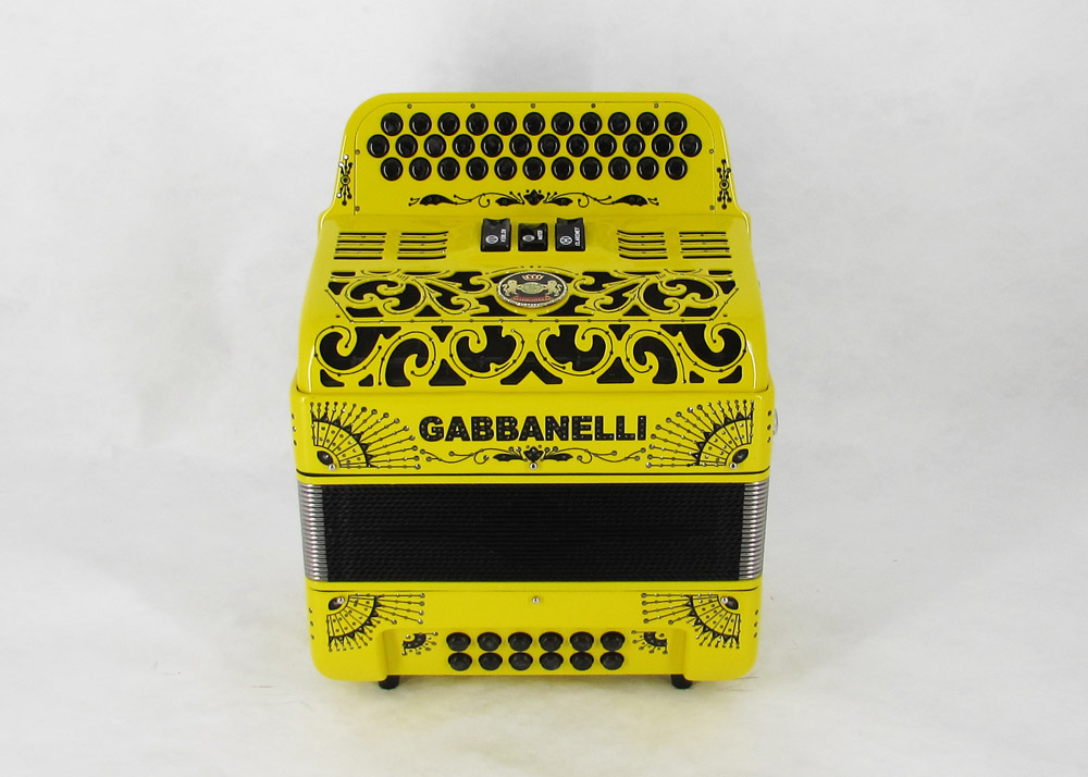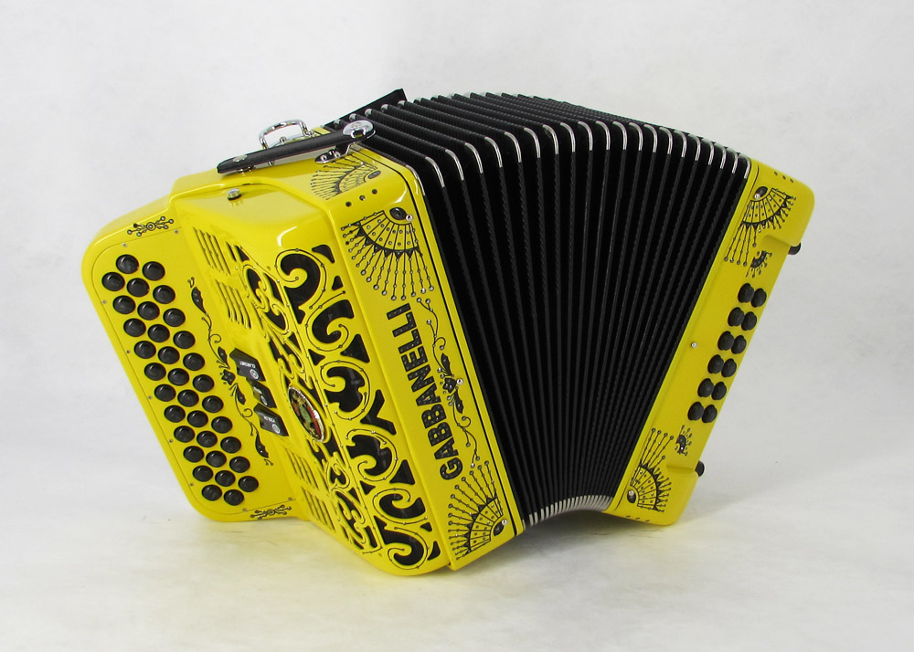 Custom designed lightweight compact Gabbanelli accordion with 3 registers 34 button. Highly preferred for its powerful sound, natural tuning and light weight compact stylish design. Handcrafted in Italy from the highest quality materials.  Gabbanelli Model 103 Compact- 34 Buttons – 3 sound registers. Bass reeds available upon request for an additional cost. Complete with case, straps and warranty.