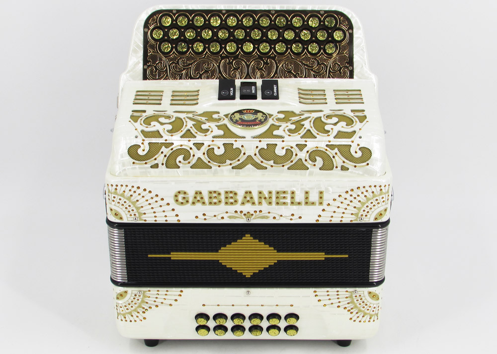 Custom designed lightweight compact Gabbanelli accordion with 3 registers 34 button. Highly preferred for its powerful sound, natural tuning and light weight compact stylish design. Handcrafted in Italy from the highest quality materials. Gabbanelli Model 103 Compact- 34 Buttons – 3 sound registers. Bass reeds available upon request. Complete with case, straps and warranty.