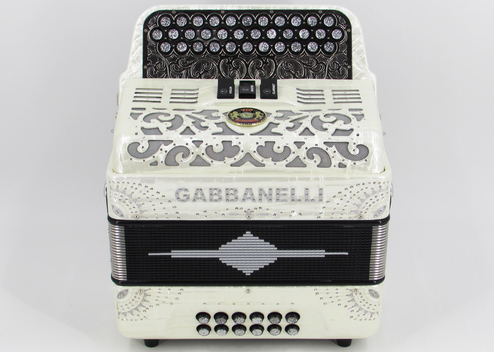 Custom designed lightweight compact Gabbanelli accordion with 3 registers 34 button. Highly preferred for its powerful sound, natural tuning and light weight compact stylish design. Handcrafted in Italy from the highest quality materials.  Gabbanelli Model 103 Compact- 34 Buttons – 3 sound registers. Bass reeds available upon request. Complete with case, straps and warranty.