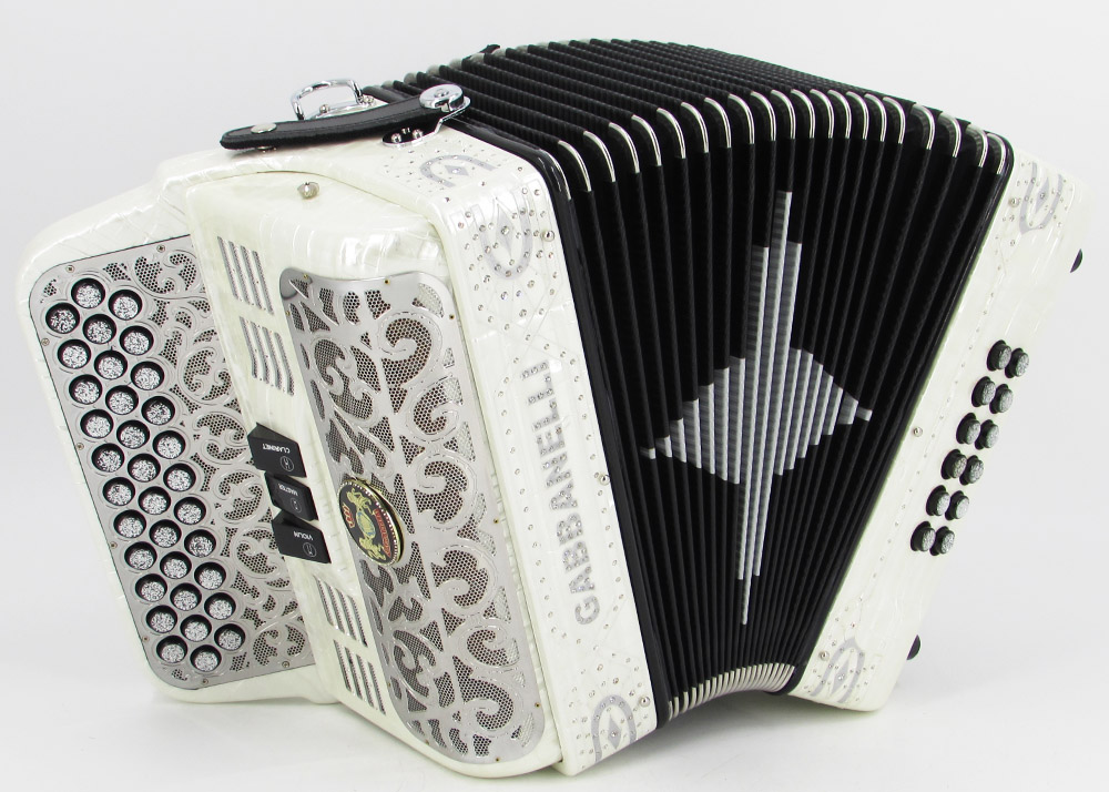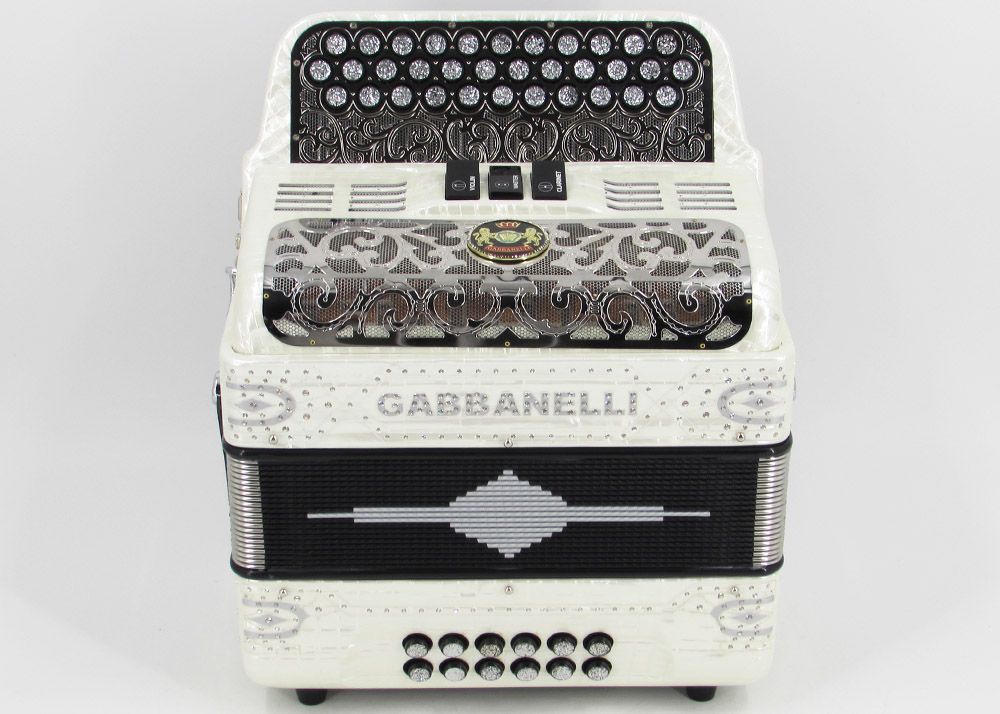 Custom designed lightweight compact Gabbanelli accordion with 3 registers 34 button. Highly preferred for its powerful sound, natural tuning and light weight compact stylish design. Handcrafted in Italy from the highest quality materials. Gabbanelli Model 103 Compact- 34 Buttons – 3 sound registers. Bass reeds available upon request. Complete with case, straps and warranty.