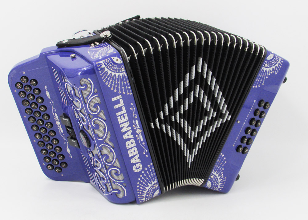 Custom designed lightweight compact Gabbanelli accordion with 3 registers 34 button. Highly preferred for its powerful sound, natural tuning and light weight compact stylish design. Handcrafted in Italy from the highest quality materials. Gabbanelli Model 103 Compact- 34 Buttons – 3 sound registers. Bass reeds available upon request. Complete with case, straps and warranty.