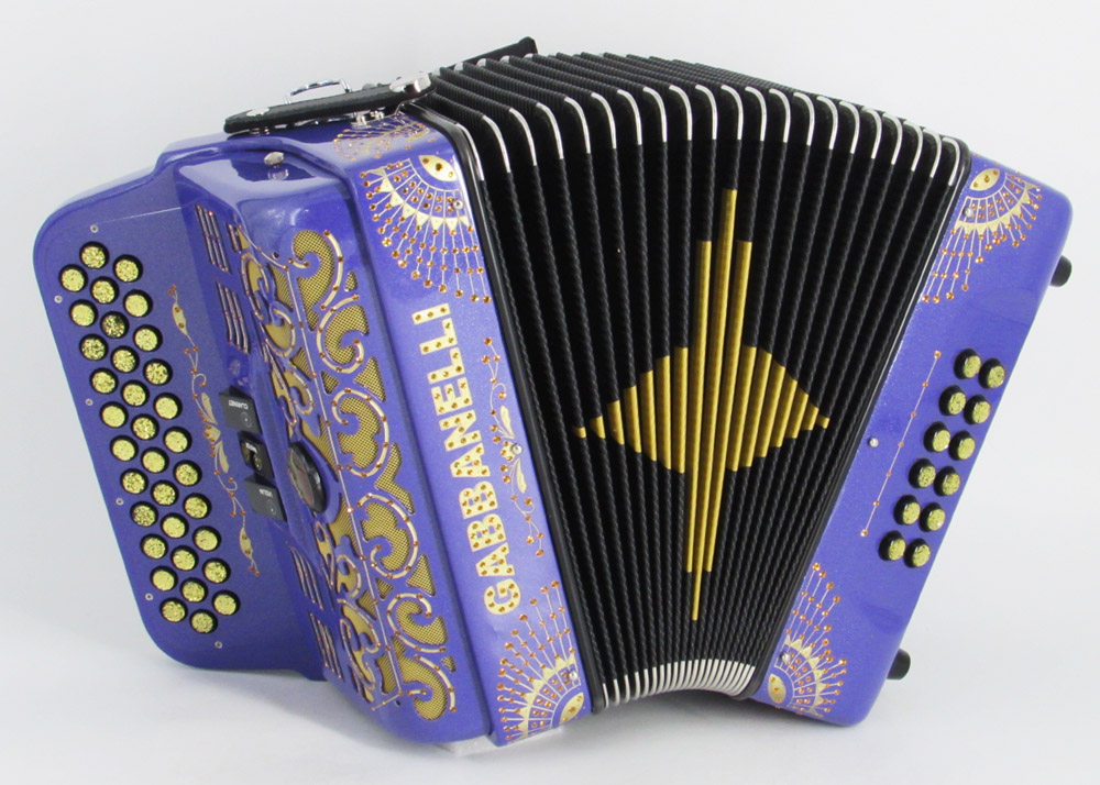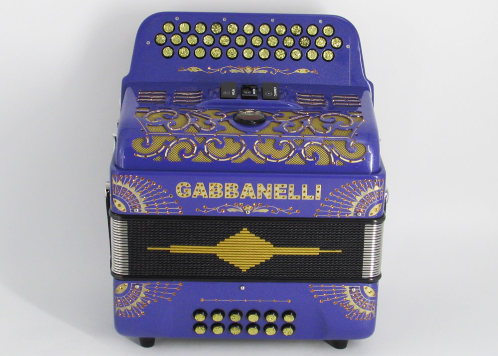Custom designed lightweight compact Gabbanelli accordion with 3 registers 34 button. Highly preferred for its powerful sound, natural tuning and light weight compact stylish design. Handcrafted in Italy from the highest quality materials. Gabbanelli Model 103 Compact- 34 Buttons – 3 sound registers. Bass reeds available upon request. Complete with case, straps and warranty.