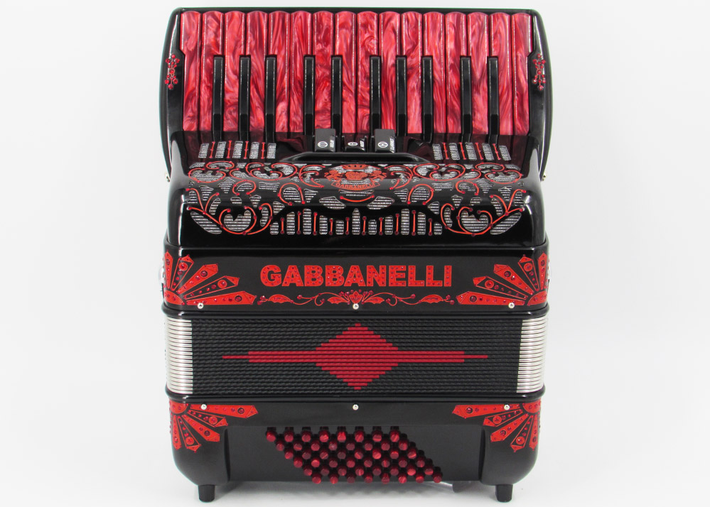 First note B. The smallest, lightest piano accordion with 16 white handmade keys, allowing you to play in any key. Features natural tuning and is handmade from the highest quality materials. Gabbanelli accordions are created from classic Italian artisan’s techniques to produce the finest quality  instrument that will last for years to come.  Complete with case, straps and warranty. Model 26- 26 Key, 48 Bass, 3 sound registers, first note on B.