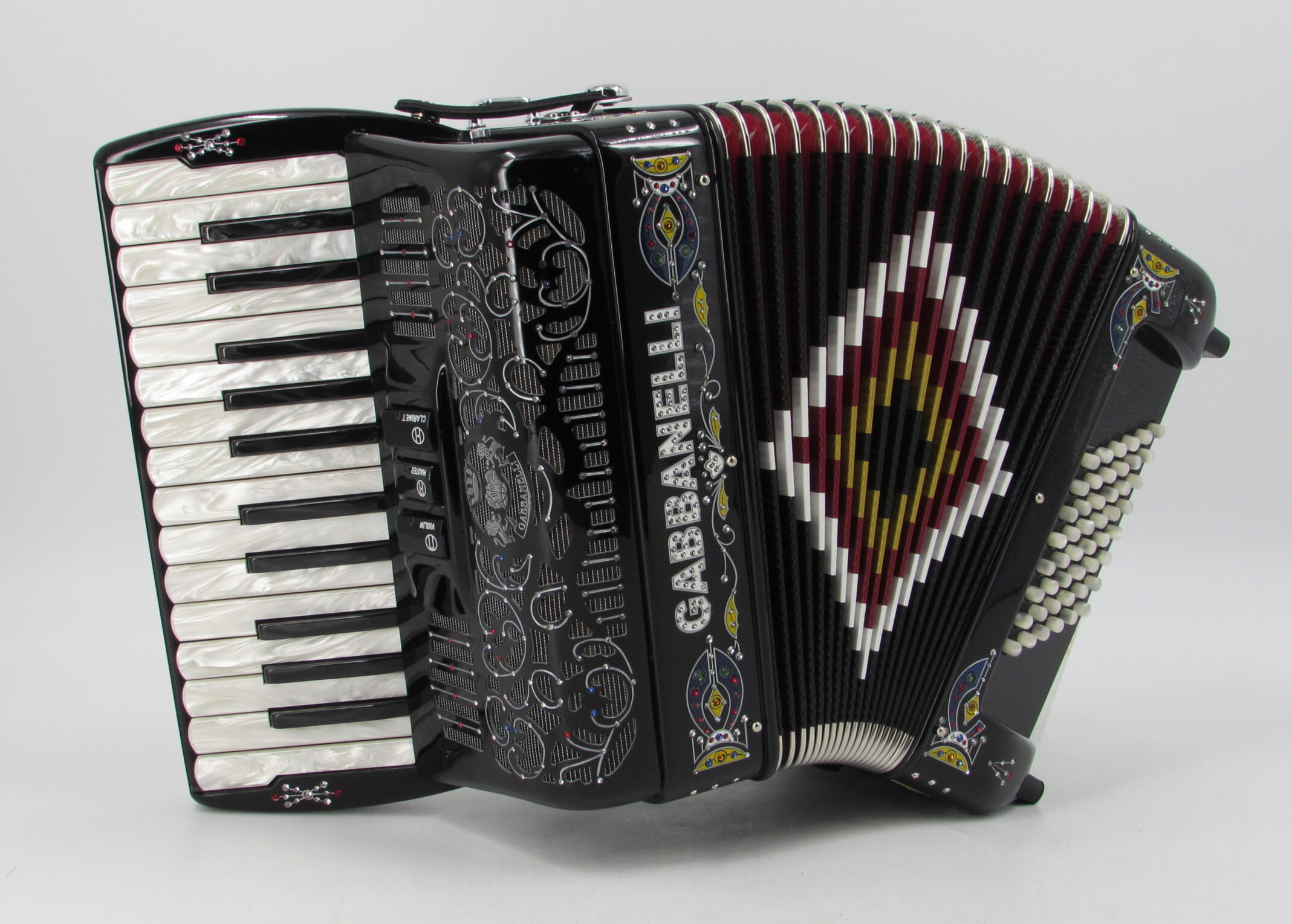 First note B. The smallest, lightest piano accordion with 16 white handmade keys, allowing you to play in any key. Features natural tuning and is handmade from the highest quality materials. Gabbanelli accordions are created from classic Italian artisan’s techniques to produce the finest quality instrument that will last for years to come. Complete with case, straps and warranty. Model 26- 26 Key, 48 Bass, 3 sound registers, first note on B.
