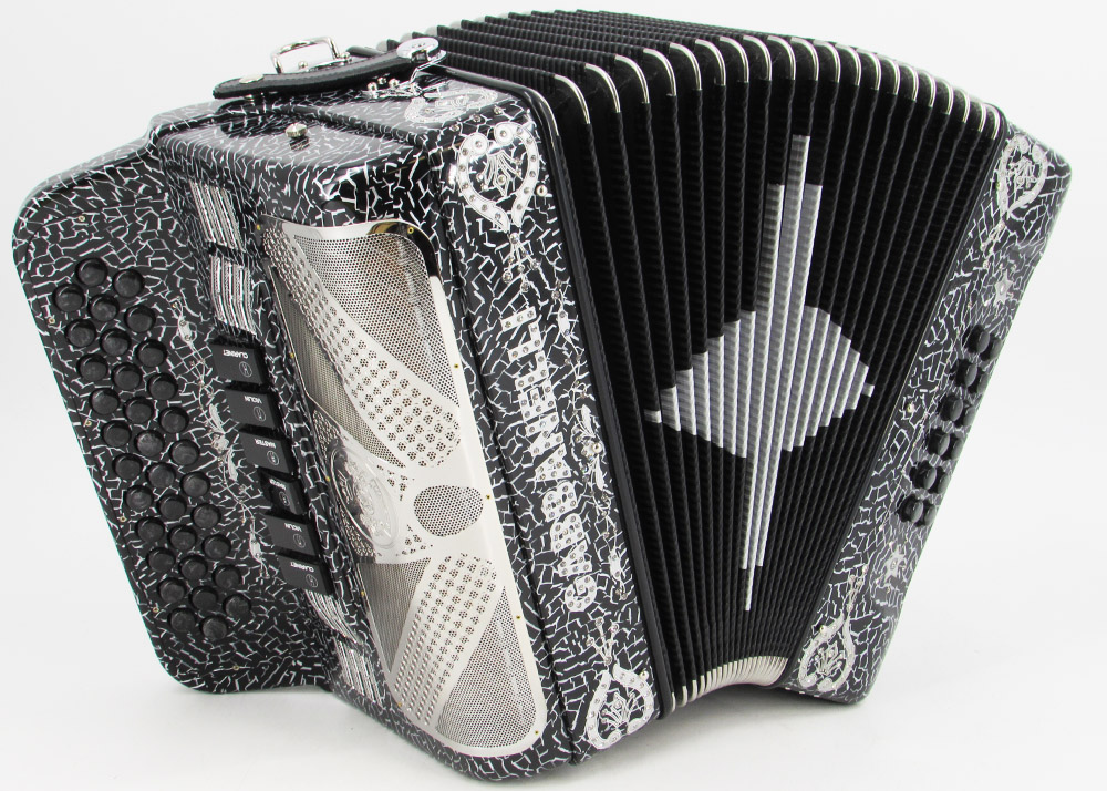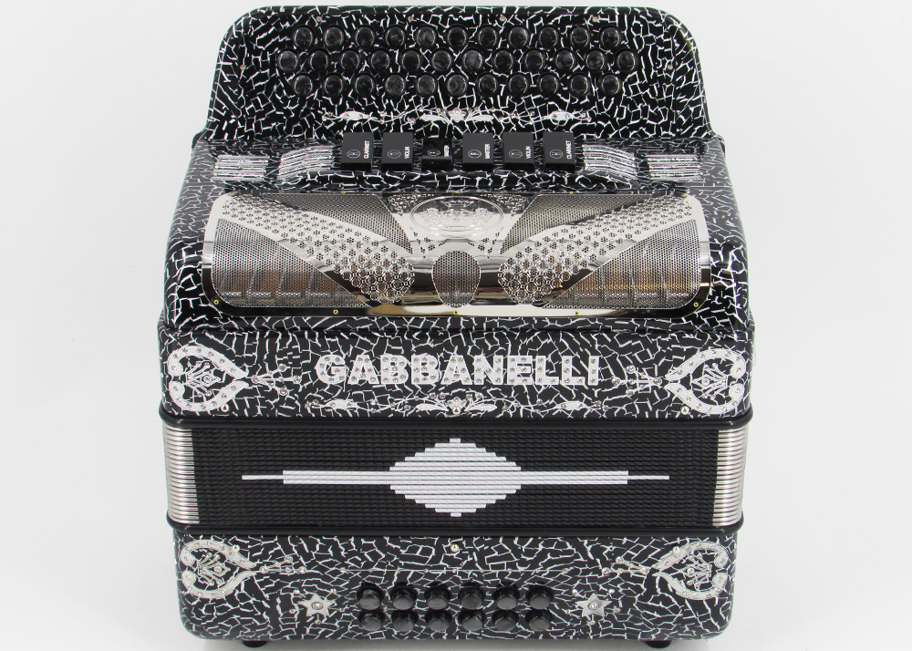 Gabbanelli Accordions designed this never-before-seen custom, compact size Gabbanelli 2 tone accordion as smaller and lighter than our classic size Gabbanelli Model 2 Tone. This Gabbanelli accordion is one of the most preferred for its versatility in changing keys at the touch of a register constructed with superior Italian artisan craftsmanship and highest quality materials. Model 2Tone Compact size-34 Buttons-two tones in one, 3 sound registers each tone. Complete with case, straps and warranty.