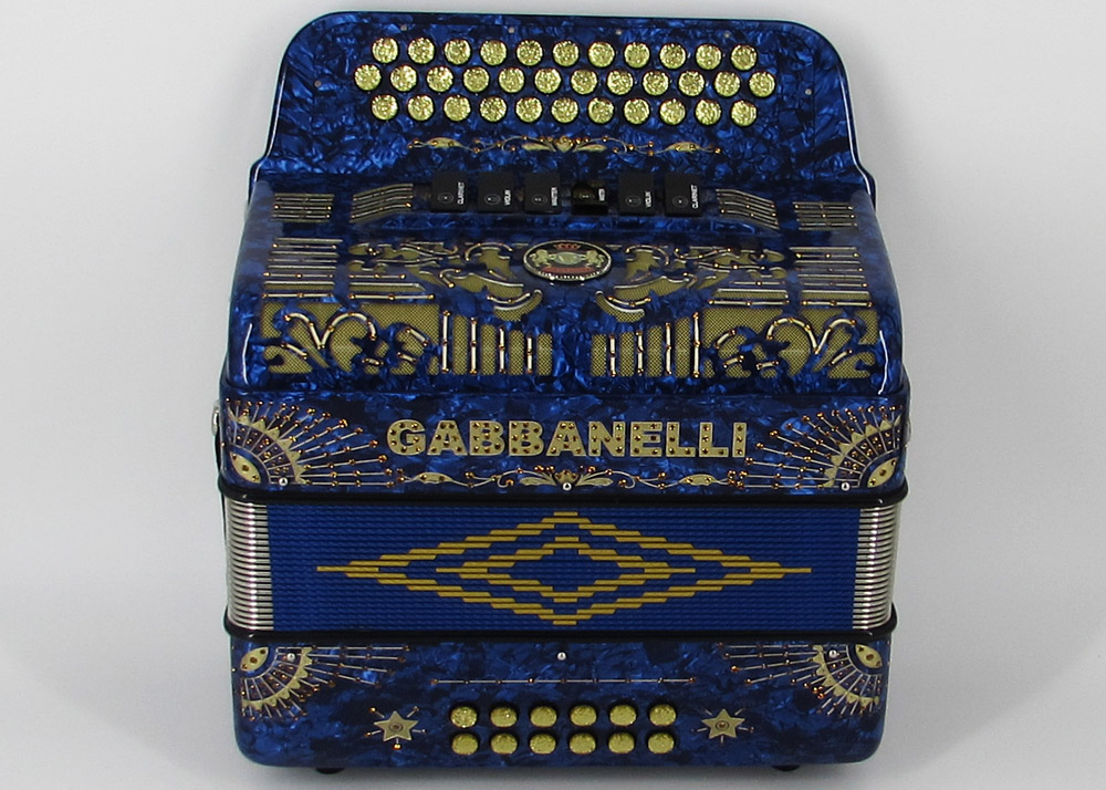 Gabbanelli Accordions designed this never-before-seen custom, compact size Gabbanelli 2 tone accordion as smaller and lighter than our classic size Gabbanelli Model 2 Tone. This Gabbanelli accordion is one of the most preferred for its versatility in changing keys at the touch of a register constructed with superior Italian artisan craftsmanship and highest quality materials. Model 2Tone Compact size-34 Buttons-two tones in one, 3 sound registers each tone. Complete with case, straps and warranty.
