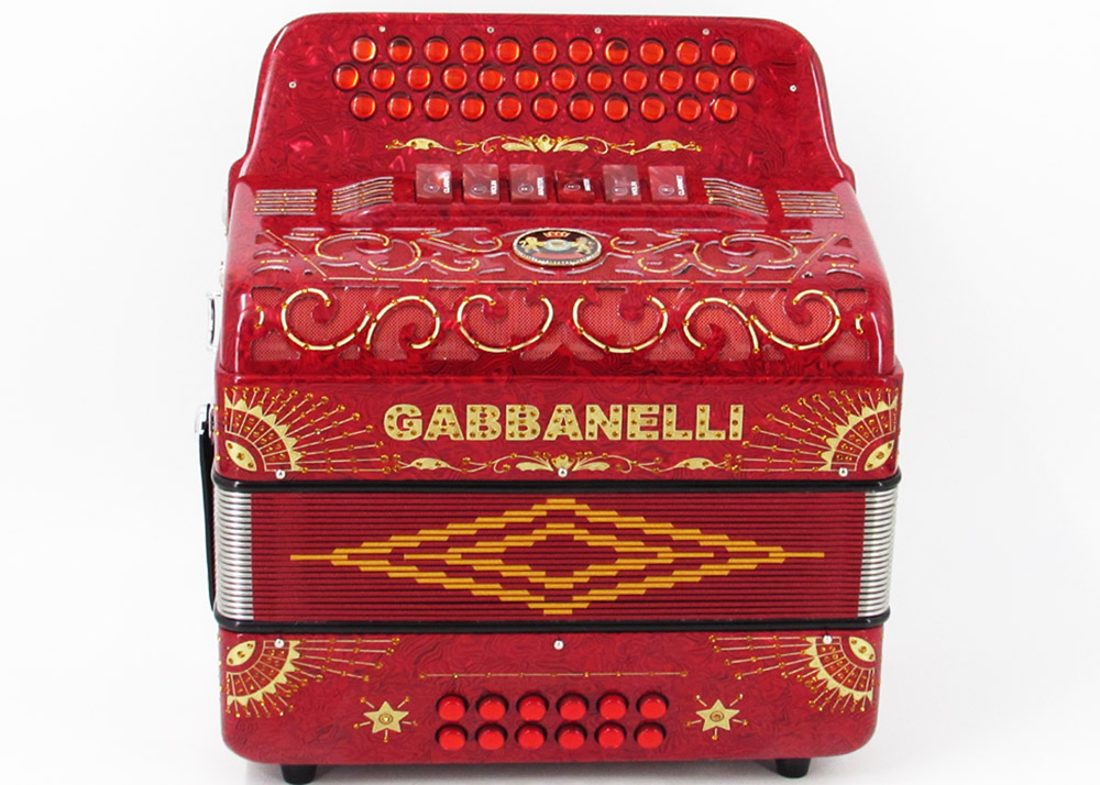 Gabbanelli Accordions designed this never-before-seen custom, compact size Gabbanelli 2 tone accordion as smaller and lighter than our classic size Gabbanelli Model 2 Tone. This Gabbanelli accordion is one of the most preferred for its versatility in changing keys at the touch of a register constructed with superior Italian artisan craftsmanship and highest quality materials. Model 2Tone Compact size-34 Buttons-two tones in one, 3 sound registers each tone. Complete with case, straps and warranty.