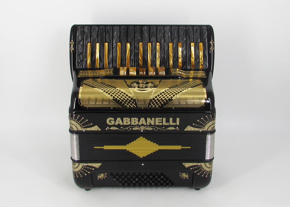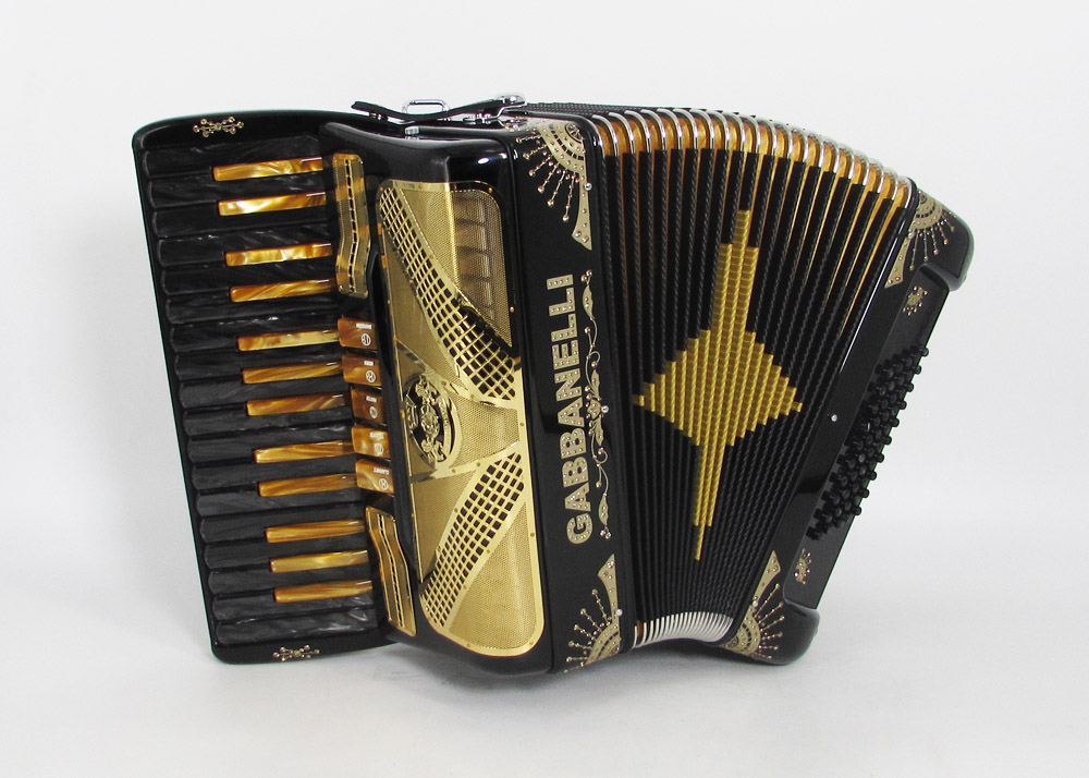 First key G. 30 handmade keys this Gabbanelli piano accordion offers 5 sound registers, and boasts the highest quality materials and craftsmanship. Gabbanelli accordions are created from classic Italian artisan’s techniques to produce the finest quality instrument that will last for years to come. Complete with case, straps and warranty. Popular professional choice for its compact size and strong sound. Model 305- 30 keys accordion with 5 switches, first key G.