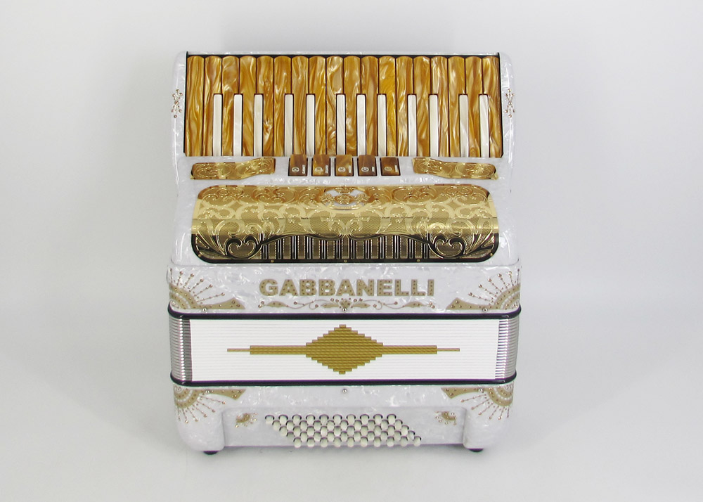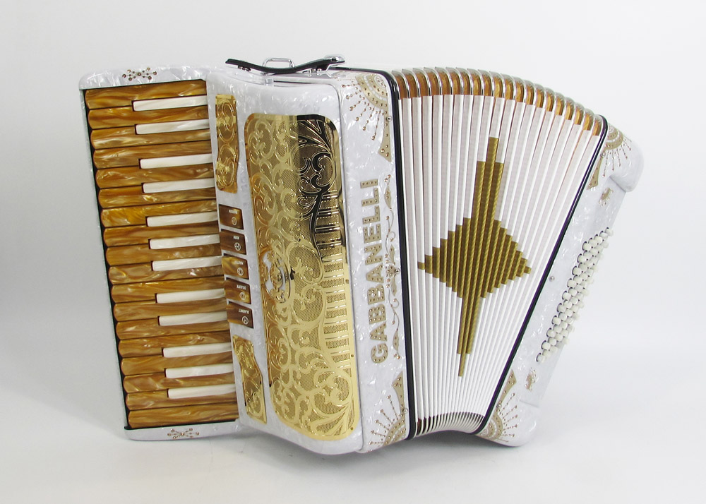 First key G. 30 handmade keys this Gabbanelli piano accordion offers 5 sound registers, and boasts the highest quality materials and craftsmanship. Gabbanelli accordions are created from classic Italian artisan’s techniques to produce the finest quality instrument that will last for years to come. Complete with case, straps and warranty. Popular professional choice for its compact size and strong sound. Model 305- 30 keys accordion with 5 switches, first key G.