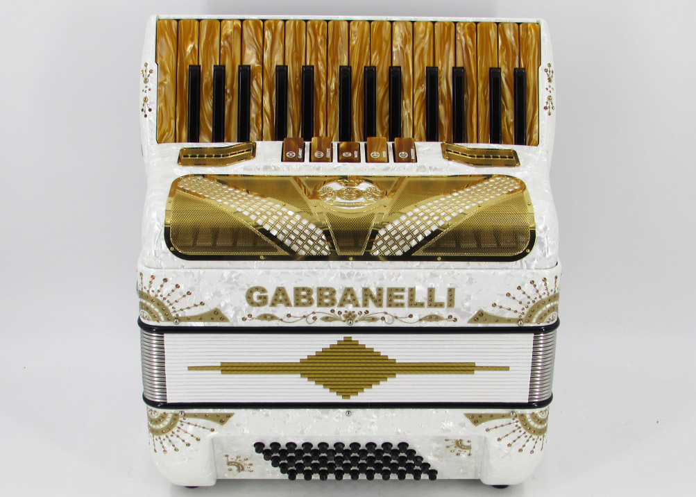 First key G. 30 handmade keys this Gabbanelli piano accordion offers 5 sound registers, and boasts the highest quality materials and craftsmanship. Gabbanelli accordions are created from classic Italian artisan’s techniques to produce the finest quality instrument that will last for years to come. Complete with case, straps and warranty. Popular professional choice for its compact size and strong sound. Model 305- 30 keys accordion with 5 switches, first key G.