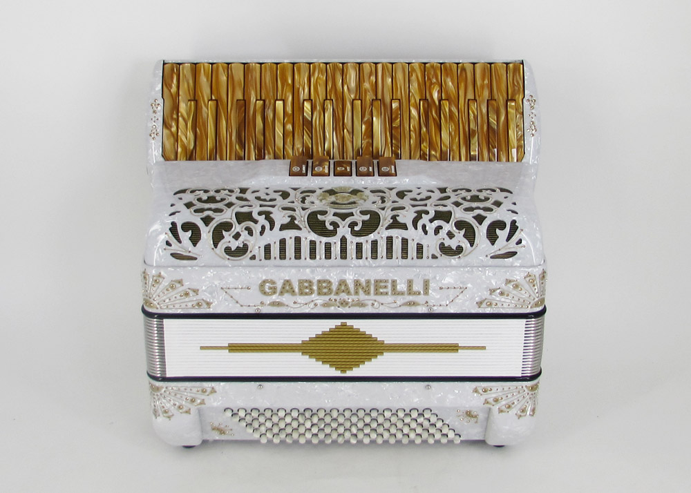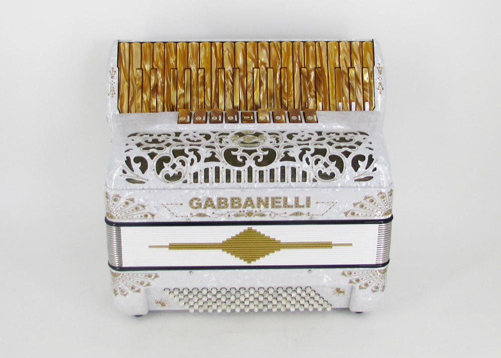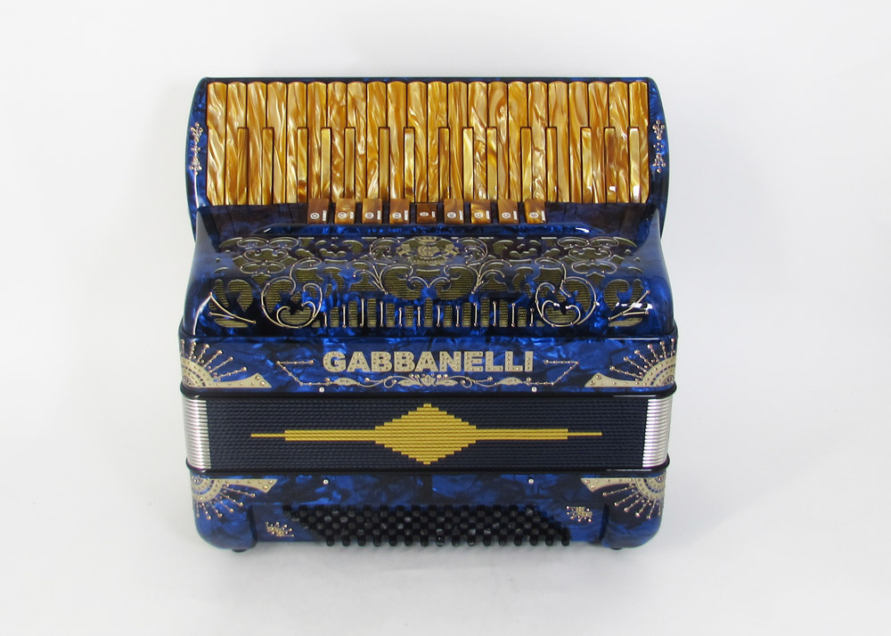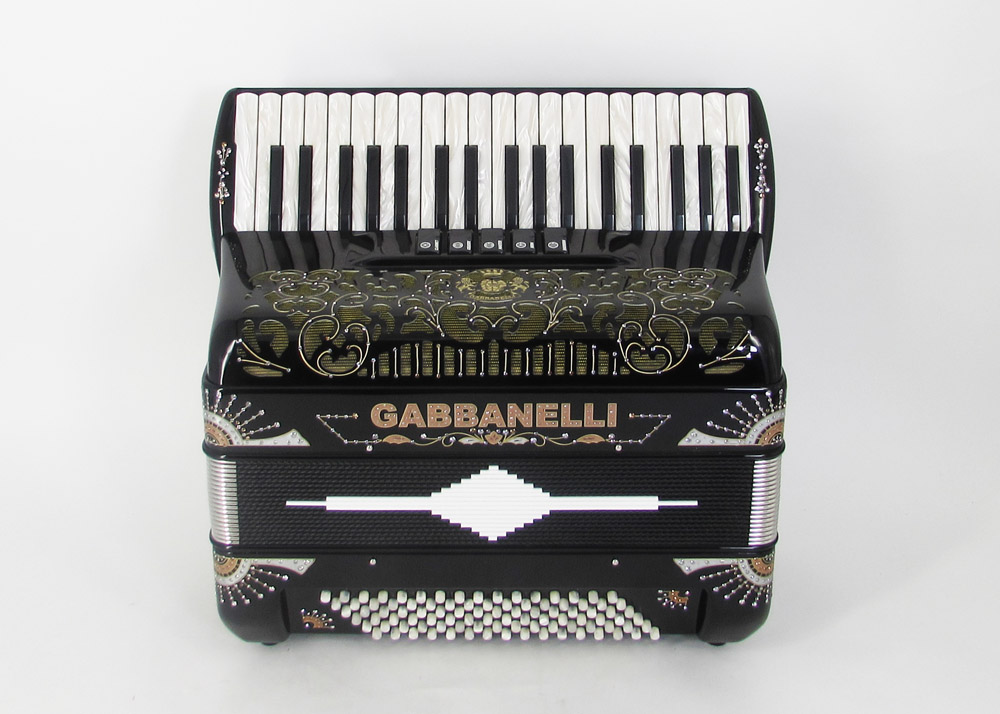 This Gabbanelli  piano-accordion offers 37 keys, first note F, 9 sound registers  handmade with the highest quality materials and craftsmanship. Light weight alternative to a full size 41 key accordion.  Gabbanelli accordions are created from classic Italian artisan’s techniques to produce the finest quality  instrument that will last for years to come.  Complete with case, straps and warranty. M37-  37 keys/96 bass  accordion. First note in F. Custom vintage Gabbanelli Grill