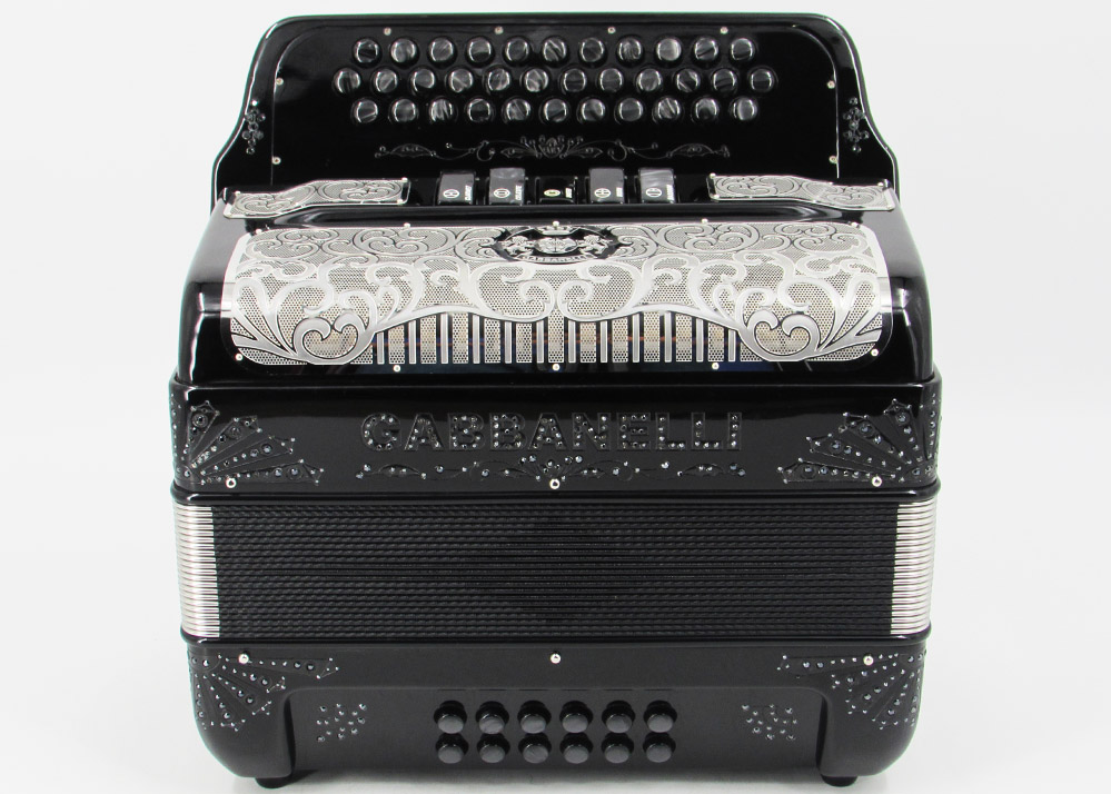 Gabbanelli Accordion in original large size 5 register. It produces deep full sound with 5 different sound effect changes, and is handcrafted from the highest quality materials, featuring the best quality reeds. This accordion is the finest instrument available and is a product of Gabbanelli Accordions’ technical and design expertise, coupled with a continued collaboration since 1961 with our accordionists evolving needs. This accordion masterpiece is the product of Gabbanelli Accordions’ decades of developments alongside only highly trained Italian artisans whom are selected to meet our standards of excellence. The Gabbanelli Model 400-34 Buttons – 5 sound registers is complete with case, straps and warranty. Bass reed blocks are available upon special request and surcharge.