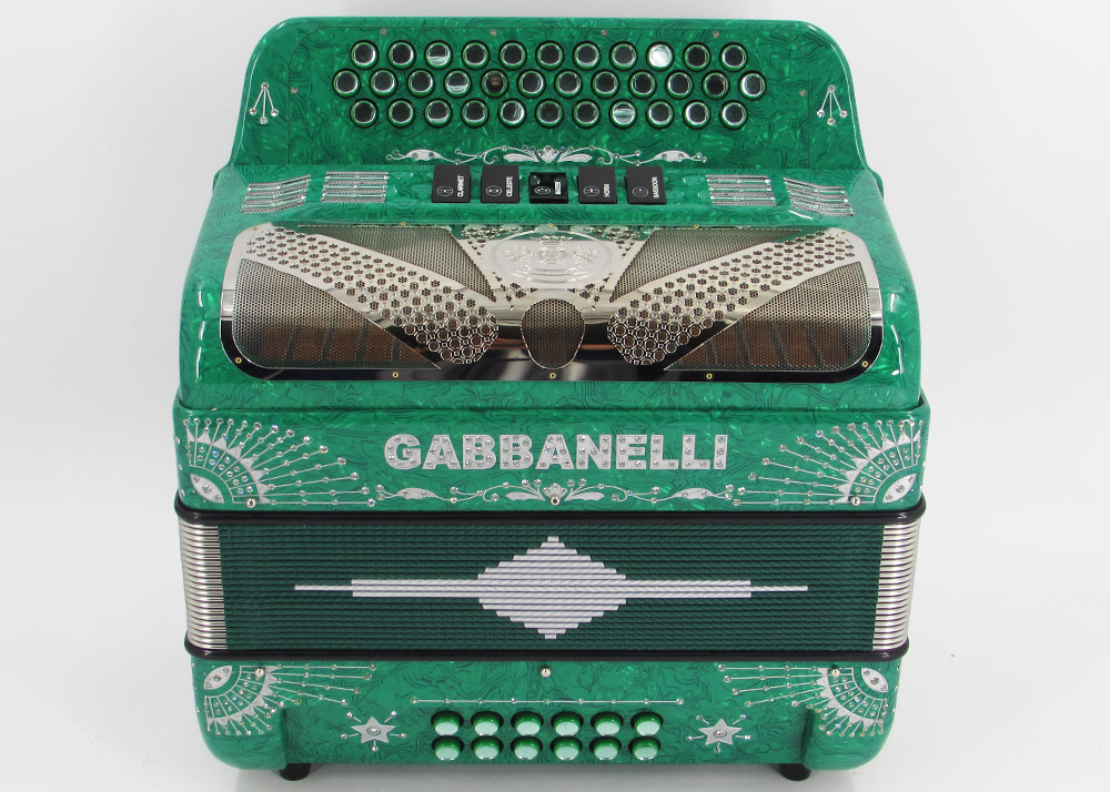 Gabbanelli Accordion in original large size 5 register. It produces deep full sound with 5 different sound effect changes, and is handcrafted from the highest quality materials, featuring the best quality reeds. This accordion is the finest instrument available and is a product of Gabbanelli Accordions’ technical and design expertise, coupled with a continued collaboration since 1961 with our accordionists evolving needs. This accordion masterpiece is the product of Gabbanelli Accordions’ decades of developments alongside only highly trained Italian artisans whom are selected to meet our standards of excellence. The Gabbanelli Model 400-34 Buttons – 5 sound registers is complete with case, straps and warranty. Bass reed blocks are available upon special request and surcharge.