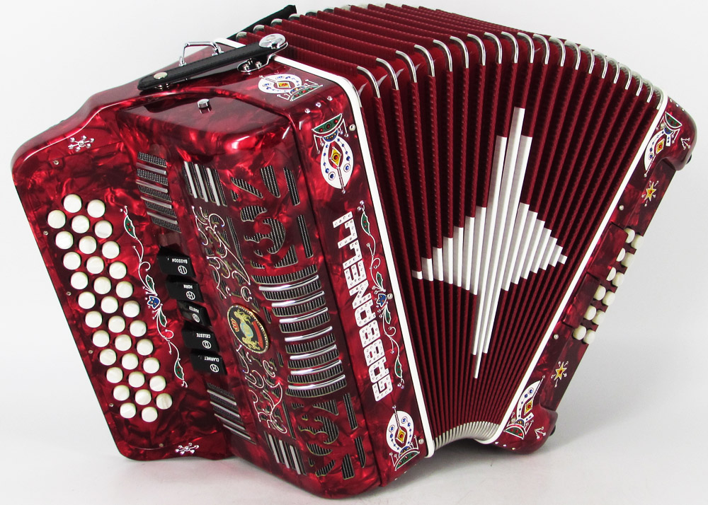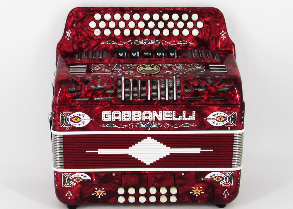 Gabbanelli Accordion in original large size 5 register. It produces deep full sound with 5 different sound effect changes, and is handcrafted from the highest quality materials, featuring the best quality reeds. This accordion is the finest instrument available and is a product of Gabbanelli Accordions technical and design expertise, coupled with a continued collaboration since 1961 with our accordionists evolving needs. This accordion masterpiece is the product of Gabbanelli Accordions decades of developments alongside only highly trained Italian artisans whom are selected to meet our standards of excellence. The Gabbanelli Model 400-34 Buttons 5 sound registers is complete with case, straps and warranty. Bass reed blocks are available upon special request and surcharge.