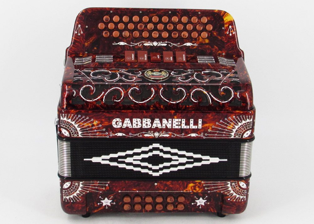 Gabbanelli Accordion in original large size 5 register. It produces deep full sound with 5 different sound effect changes, and is handcrafted from the highest quality materials, featuring the best quality reeds. This accordion is the finest instrument available and is a product of Gabbanelli Accordions’ technical and design expertise, coupled with a continued collaboration since 1961 with our accordionists evolving needs. This accordion masterpiece is the product of Gabbanelli Accordions’ decades of developments alongside only highly trained Italian artisans whom are selected to meet our standards of excellence. The Gabbanelli Model 400-34 Buttons – 5 sound registers is complete with case, straps and warranty. Bass reed blocks are available upon special request and surcharge.