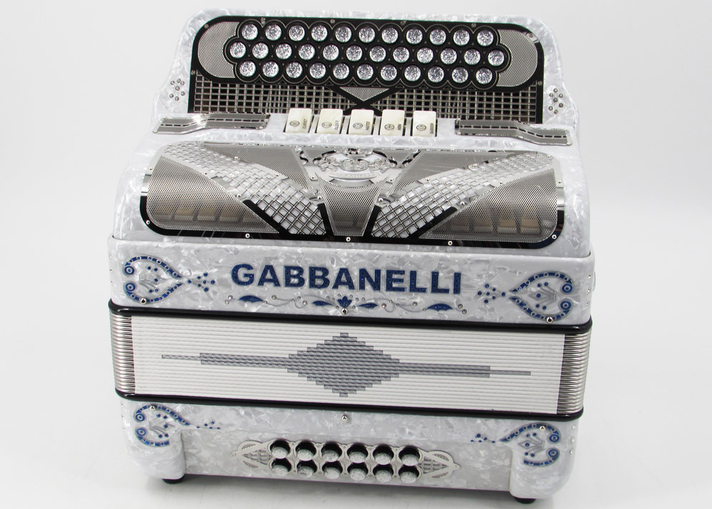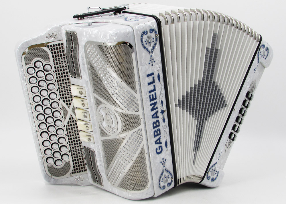 Gabbanelli Accordion in original large size 5 register. It produces deep full sound with 5 different sound effect changes, and is handcrafted from the highest quality materials, featuring the best quality reeds. This accordion is the finest instrument available and is a product of Gabbanelli Accordions’ technical and design expertise, coupled with a continued collaboration since 1961 with our accordionists evolving needs. This accordion masterpiece is the product of Gabbanelli Accordions’ decades of developments alongside only highly trained Italian artisans whom are selected to meet our standards of excellence. The Gabbanelli Model 400-34 Buttons – 5 sound registers is complete with case, straps and warranty. Bass reed blocks are available upon special request and surcharge.