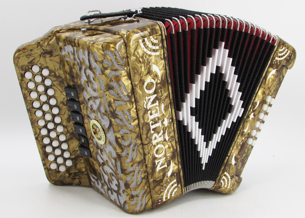 Gabbanelli accordions specially designed the Norteño Brand by customer request for an economical version of a Gabbanelli accordion. The Norteño brand accordions are handmade in China, with Italian reeds, high quality with crystal décor. New-complete line of No register, 3 register, 5 register and 2 tone models available in the Norteño brand accordions. Complete with case and straps.
