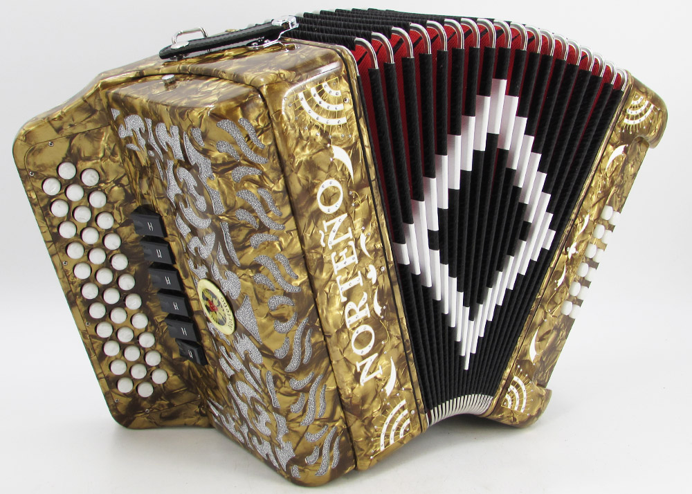 Gabbanelli accordions specially designed the Norteño Brand by customer request for an economical version of a Gabbanelli accordion. The Norteño brand accordions are handmade in China, with Italian reeds, high quality with crystal décor. New-complete line of No register, 3 register, 5 register and 2 tone models available in the Norteño brand accordions. Complete with case and straps.