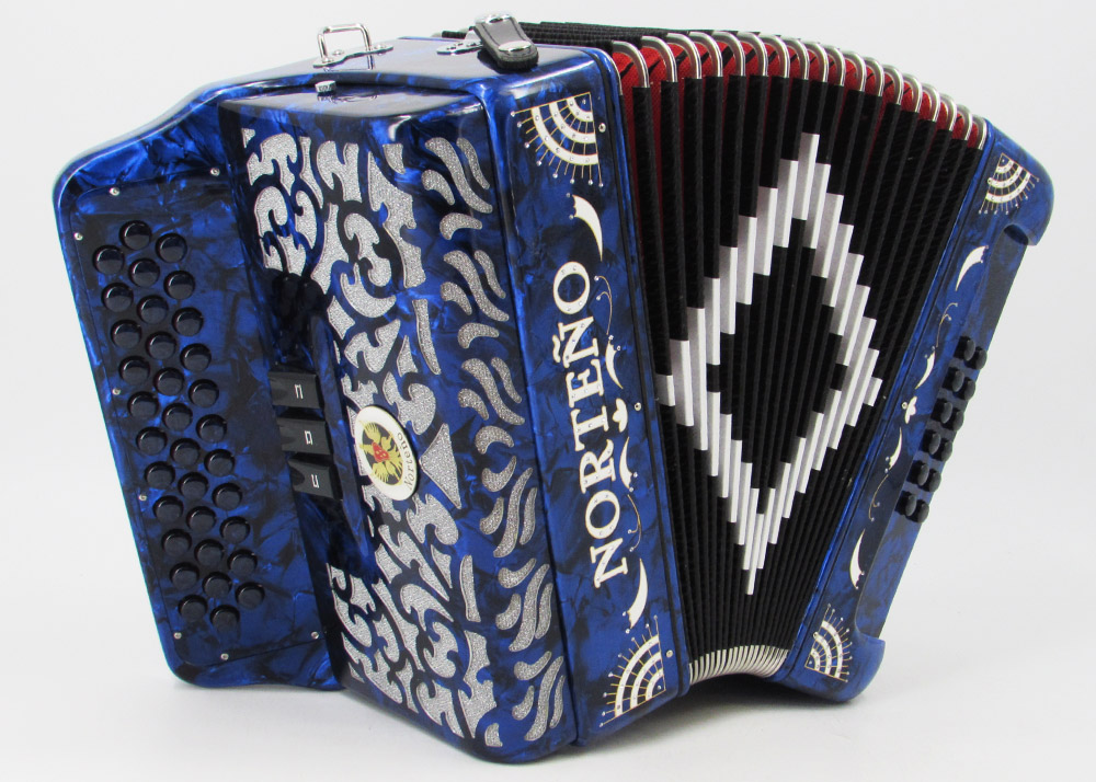 Gabbanelli accordions specially designed the Norteño Brand by customer request for an economical version of a Gabbanelli accordion. The Norteño brand accordions are handmade in China, with Italian reeds, high quality with crystal décor. New-complete line of No register, 3 register, 5 register and 2 tone models available in the Norteño brand accordions. Complete with case and straps.