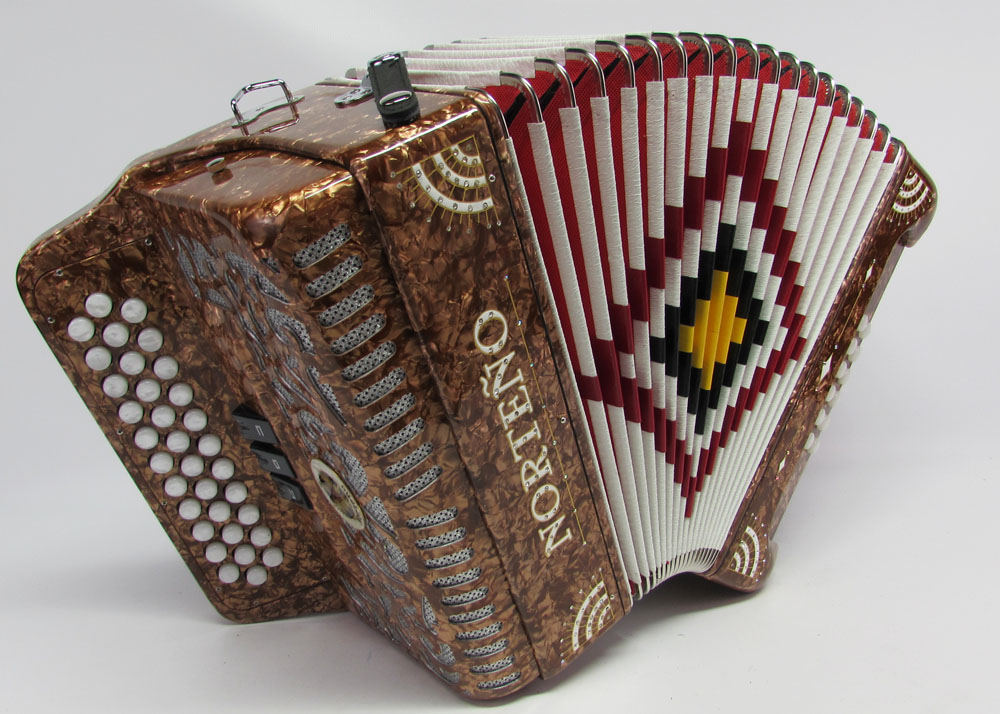Gabbanelli accordions specially designed the Norteño Brand by customer request for an economical version of a Gabbanelli accordion. The Norteño brand accordions are handmade in China, with Italian reeds, high quality with crystal décor. New-complete line of No register, 3 register, 5 register and 2 tone models available in the Norteño brand accordions. Complete with case and straps.