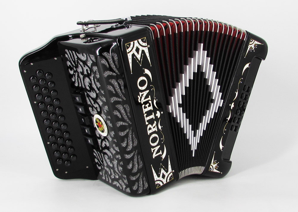 Gabbanelli accordions specially designed the Norteño Brand by customer request for an economical version of a Gabbanelli accordion. The Norteño brand accordions are handmade in China, with Italian reeds, high quality with crystal décor. New-complete line of No register, 3 register, 5 register and 2 tone models available in the Norteño brand accordions. Complete with case and straps.