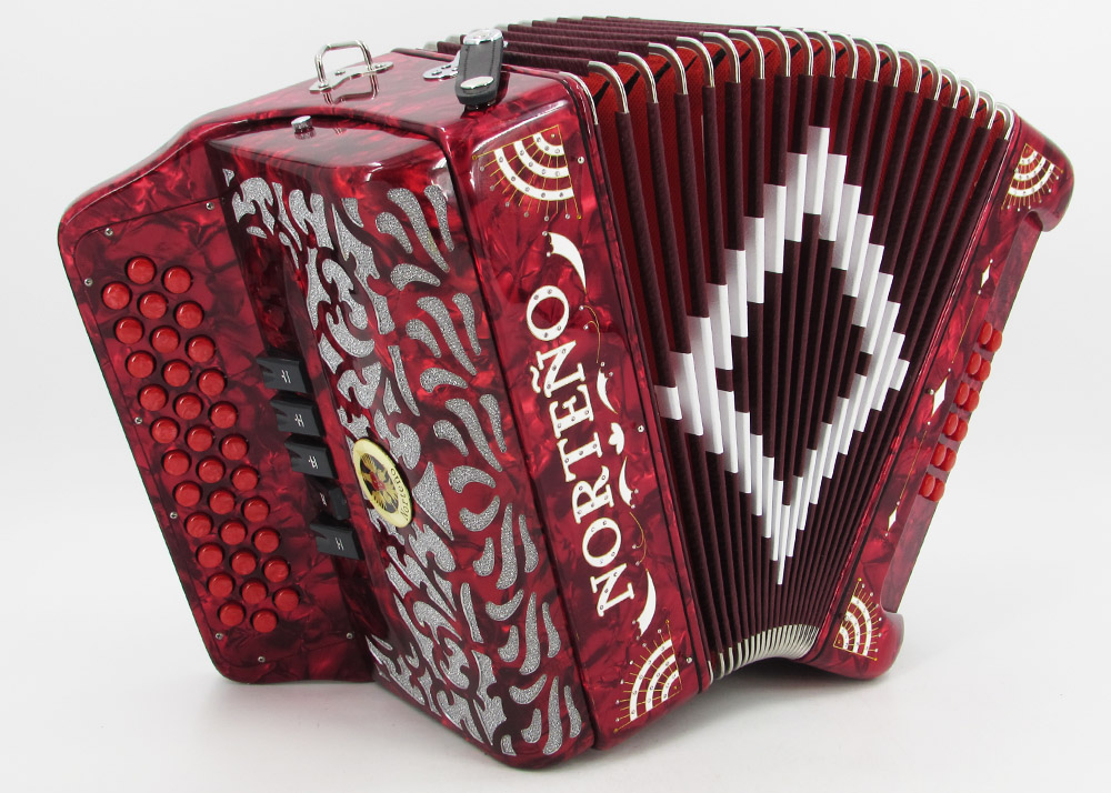Gabbanelli accordions specially designed the Norteño Brand by customer request for an economical version of a Gabbanelli accordion. The Norteño brand accordions are handmade in China, with Italian reeds, high quality with crystal décor. New-complete line of No register, 3 register, 5 register and 2 tone models available in the Norteño brand accordions. Complete with case and straps.
