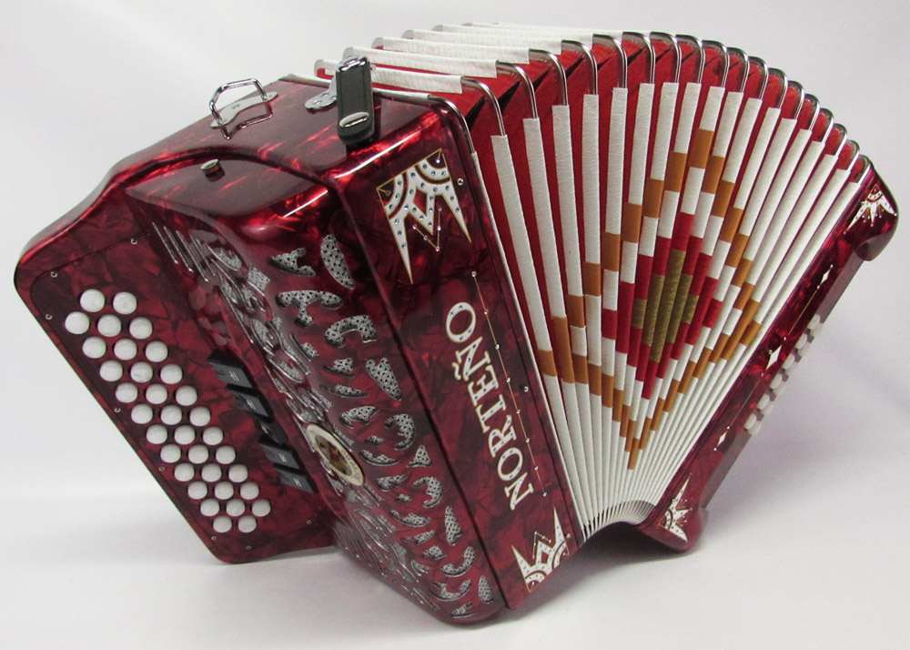 Gabbanelli accordions specially designed the Norteño Brand by customer request for an economical version of a Gabbanelli accordion. The Norteño brand accordions are handmade in China, with Italian reeds, high quality with crystal décor. New-complete line of No register, 3 register, 5 register and 2 tone models available in the Norteño brand accordions. Complete with case and straps.