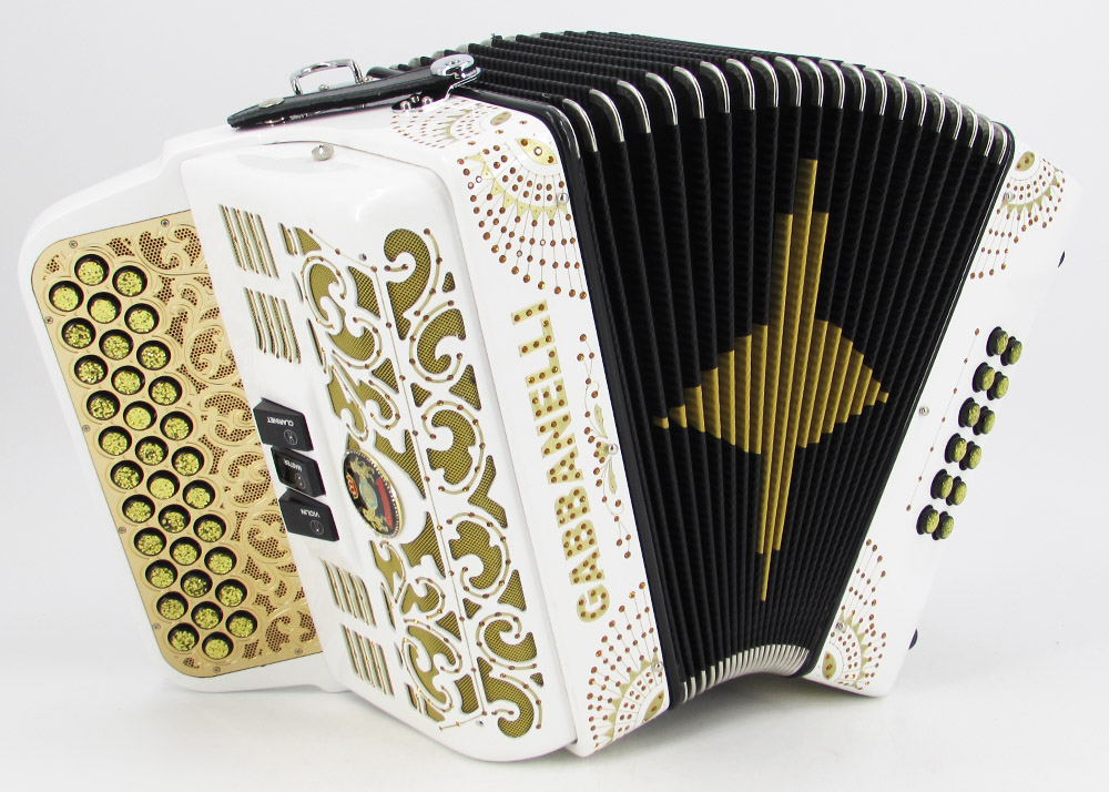 Acordeón Gabbanelli compacto y ligero de 3 registros y 34 Botones. Altamente preferido por su sonido poderoso, natural entonación y bajo peso en un diseño estilizado. Ensamblado a mano en Italia, con los materiales de la más alta calidad. Gabbanelli Modelo Compacto 103- 34 Botones – 3 registros de sonido. Disponible también con voces de bajos, mediante pedido especial. Incluye estuche, correas y garantía.